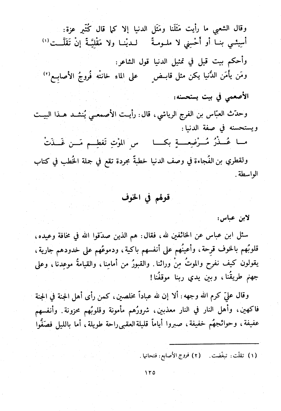 سئل ابن عباس عن الخائفين لله، فقال: هم الذين صدّقوا الله في مخافة وعيده، قلوبهم بالخوف قرحة، وأعينهم على أنفسهم باكية، ودموعهم على خدودهم جارية، يقولون كيف نفرح والموت من ورائنا. والقبور من أمامنا، والقيامة موعدنا، وعلى جهنم طريقنا، وبين يدي ربنا موقفنا! وقال عليّ كرم الله وجهه: ألا إن الله عبادا مخلصين، كمن رأى أهل الجنة في الجنة فاكهين، وأهل النار في النار معذبين، شرورهم مأمونة وقلوبهم محزونة. وأنفسهم عفيفة، وحوائجهم خفيفة، صبروا أياما قليلة العقبى راحة طويلة، أما بالليل فصفّوا