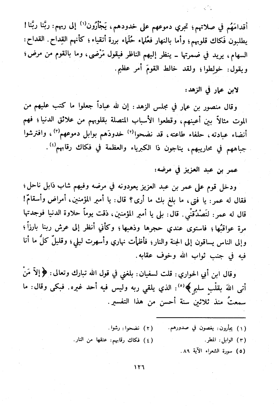 ودخل قوم على عمر بن عبد العزيز يعودونه في مرضه وفيهم شاب ذابل ناحل؛ فقال له عمر: يا فتى، ما بلغ بك ما أرى؟ قال: يا أمير المؤمنين، أمراض وأسقام! قال له عمر: لتصدقنّي. قال: بلى يا أمير المؤمنين، ذقت يوما حلاوة الدنيا فوجدتها مرة عواقبها؛ فاستوى عندي حجرها وذهبها؛ وكأني أنظر إلى عرش ربنا بارزا؛ وإلى الناس يساقون إلى الجنة والنار؛ فأظمأت نهاري وأسهرت ليلي؛ وقليل كلّ ما أنا فيه في جنب ثواب الله وخوف عقابه.