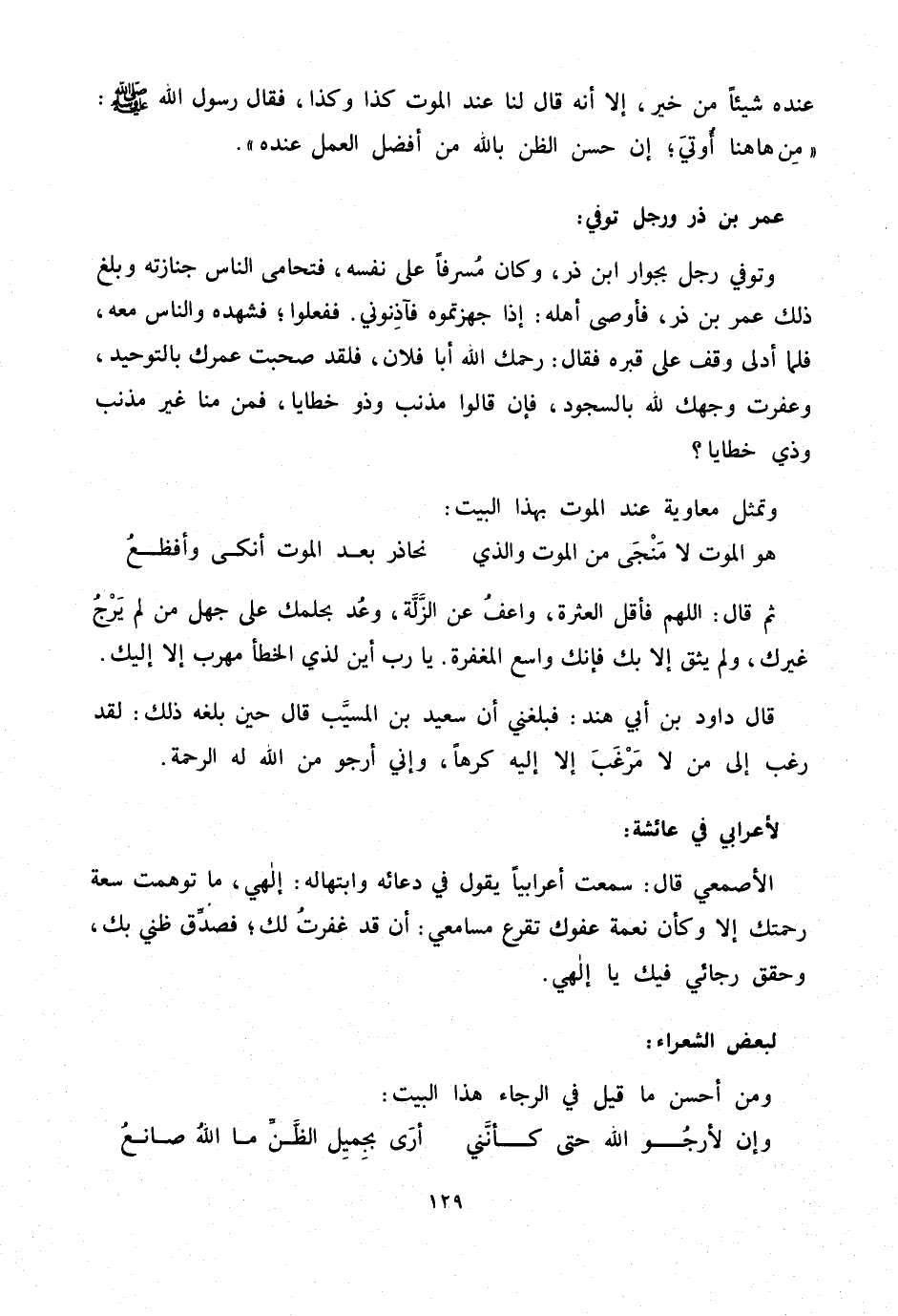 الأصمعي قال: سمعت أعرابيا يقول في دعائه وابتهاله: إلهي، ما توهمت سعة رحمتك إلا وكأن نعمة عفوك تقرع مسامعي: أن قد غفرت لك؛ فصدّق ظني بك.