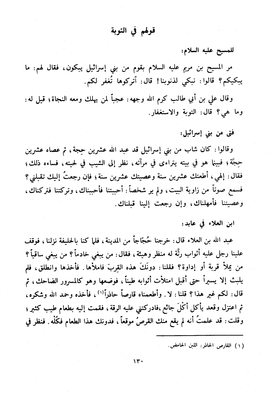 مر المسيح بن مريم عليه السّلام بقوم من بني إسرائيل يبكون، فقال لهم: ما يبكيكم؟ قالوا: نبكي لذنوبنا! قال: اتركوها تغفر لكم.