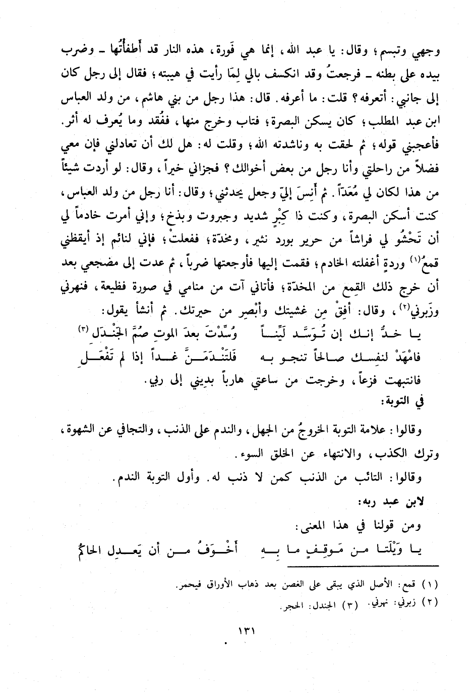 فأعجبني قوله؛ ثم لحقت به وناشدته الله؛ وقلت له: هل لك أن تعادلني فإن معي فضلا من راحلتي وأنا رجل من بعض أخوالك؟ فجزاني خيرا، وقال: لو أردت شيئا من هذا لكان لي معدّا. ثم أنس إليّ وجعل يحدثني؛ وقال: أنا رجل من ولد العباس، كنت أسكن البصرة، وكنت ذا كبر شديد وجبروت وبذخ؛ وإني أمرت خادما لي أن تحشو لي فراشا من حرير بورد نثير، ومخدّة؛ ففعلت؛ فإني لنائم إذ أيقظني قمع «1» وردة أغفلته الخادم؛ فقمت إليها فأوجعتها ضربا، ثم عدت إلى مضجعي بعد أن خرج ذلك القمع من المخدّة؛ فأتاني آت من منامي في صورة فظيعة، فنهرني وزبرني «2» ، وقال: أفق من غشيتك وأبصر من حيرتك. ثم أنشأ يقول: