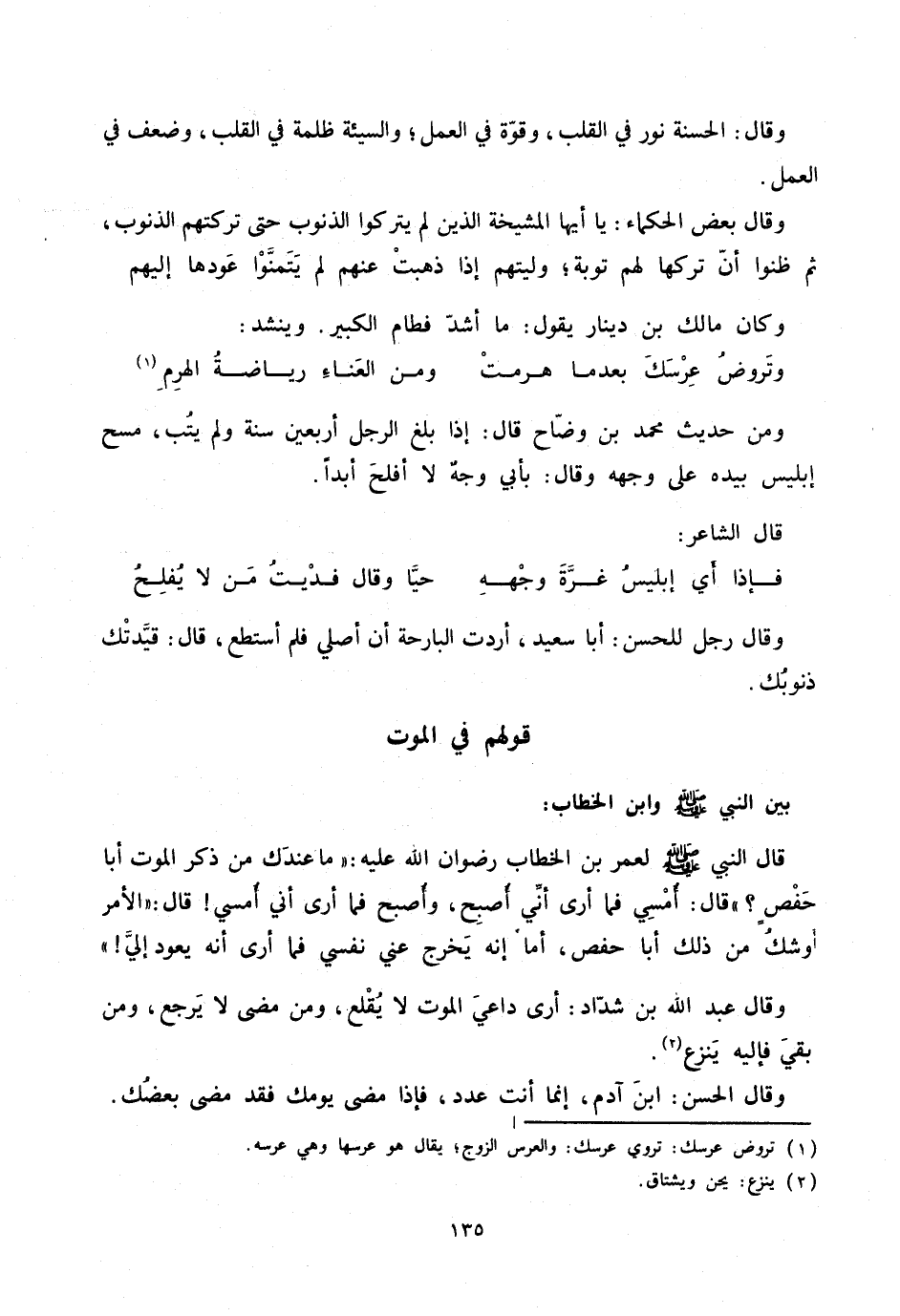 قال النبي صلّى الله عليه وسلم لعمر بن الخطاب رضوان الله عليه: «ما عندك من ذكر الموت أبا حفص؟» قال: أمسي فما أرى أنّي أصبح، وأصبح فما أرى أني أمسي! قال: «الأمر أوشك من ذلك أبا حفص، أما إنه يخرج عني نفسي فما أرى أنه يعود إليّ!» وقال عبد الله بن شدّاد: أرى داعي الموت لا يقلع، ومن مضى لا يرجع، ومن بقي فإليه ينزع «2» .
