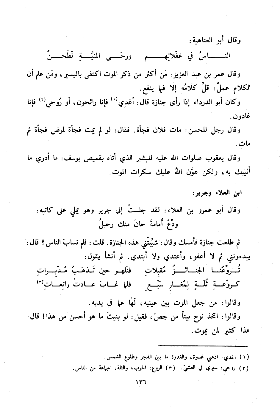 وكان أبو الدرداء إذا رأى جنازة قال: اغدي «1» فإنا رائحون، أو روحي «2» فإنا غادون.