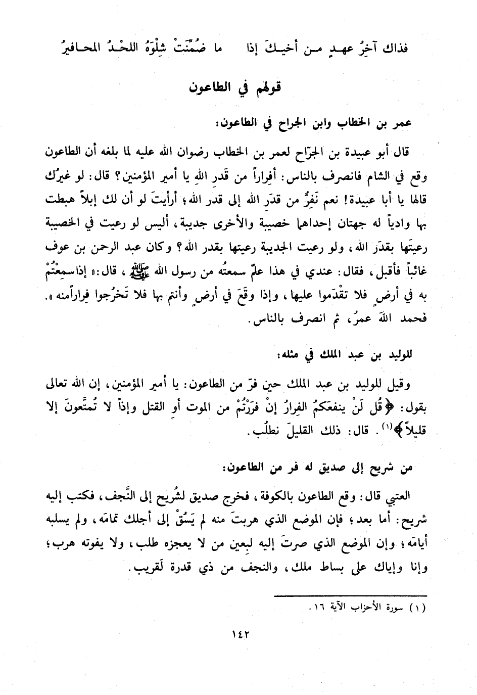 وقيل للوليد بن عبد الملك حين فرّ من الطاعون: يا أمير المؤمنين، إن الله تعالى بقول: قُلْ لَنْ يَنْفَعَكُمُ الْفِرارُ إِنْ فَرَرْتُمْ مِنَ الْمَوْتِ أَوِ الْقَتْلِ وَإِذاً لا تُمَتَّعُونَ إِلَّا قَلِيلًا