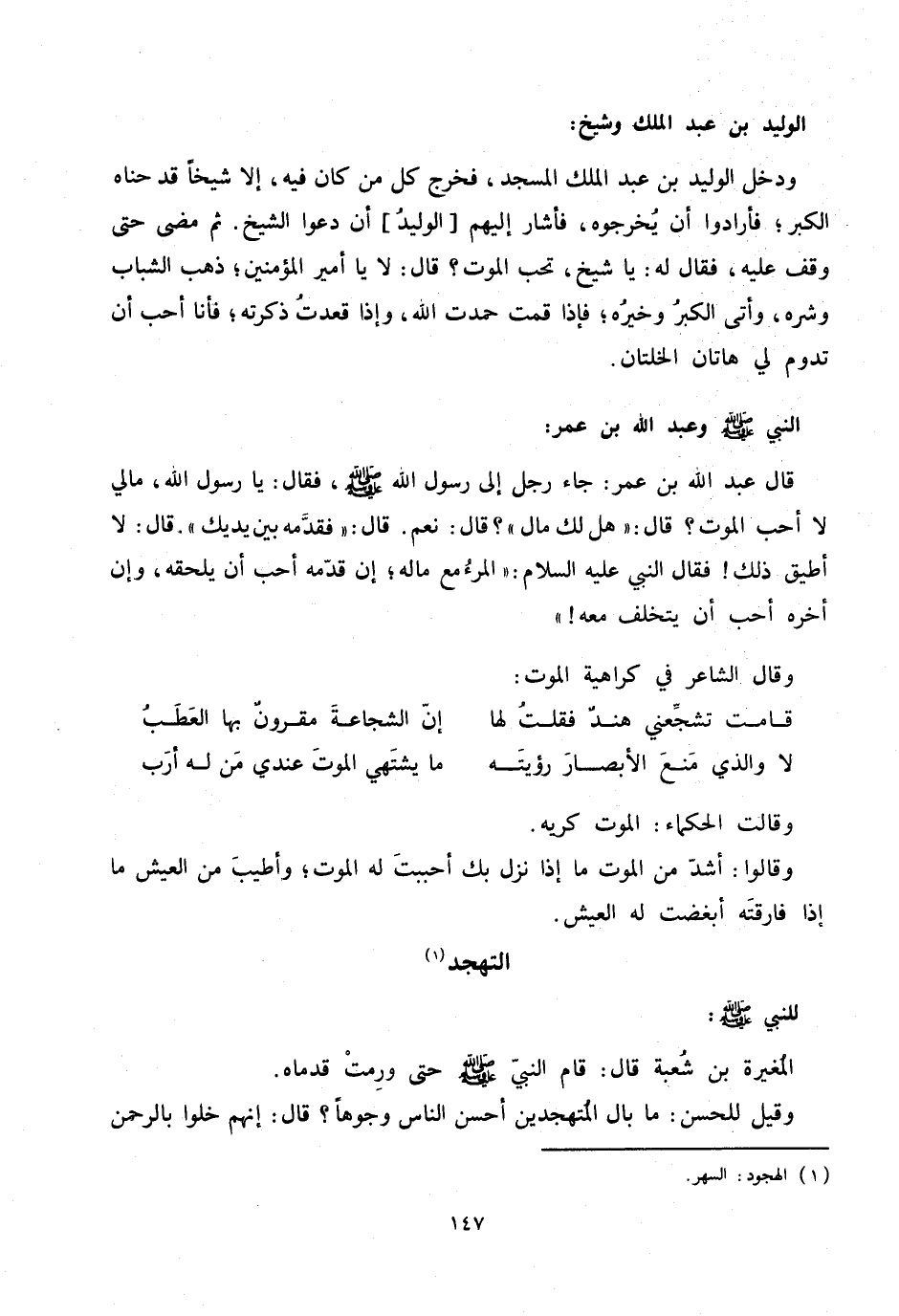 ودخل الوليد بن عبد الملك المسجد، فخرج كل من كان فيه، إلا شيخا قدحناه الكبر؛ فأرادوا أن يخرجوه، فأشار إليهم [الوليد] أن دعوا الشيخ. ثم مضى حتى وقف عليه، فقال له: يا شيخ، تحب الموت؟ قال: لا يا أمير المؤمنين؛ ذهب الشباب وشره، وأتى الكبر وخيره؛ فإذا قمت حمدت الله، وإذا قعدت ذكرته؛ فأنا أحب أن تدوم لي هاتان الخلتان.