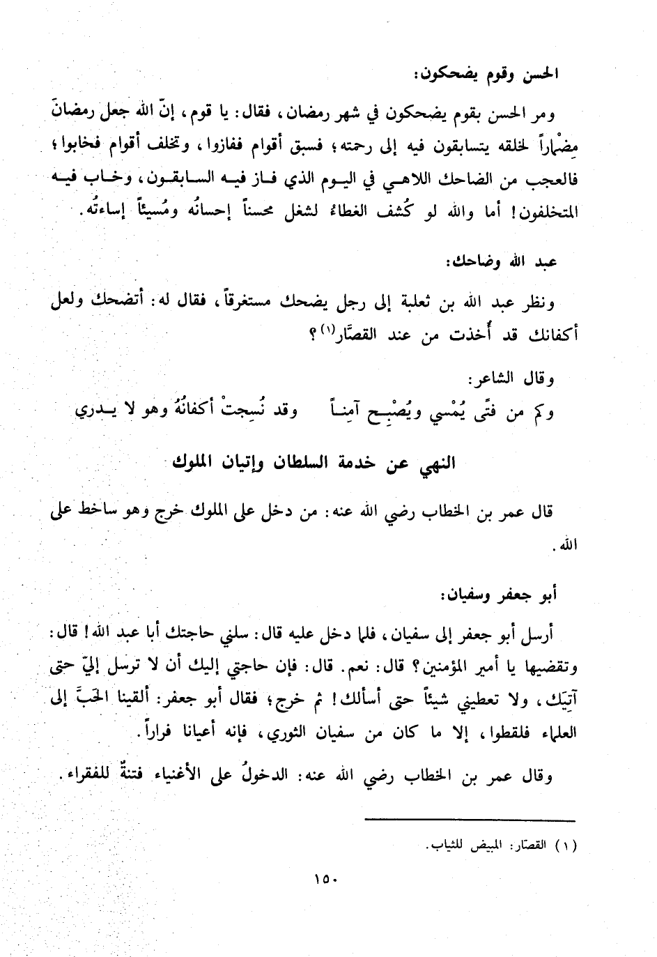 ونظر عبد الله بن ثعلبة إلى رجل يضحك مستغرقا، فقال له: أتضحك ولعل أكفانك قد أخذت من عند القصّار «1» ؟