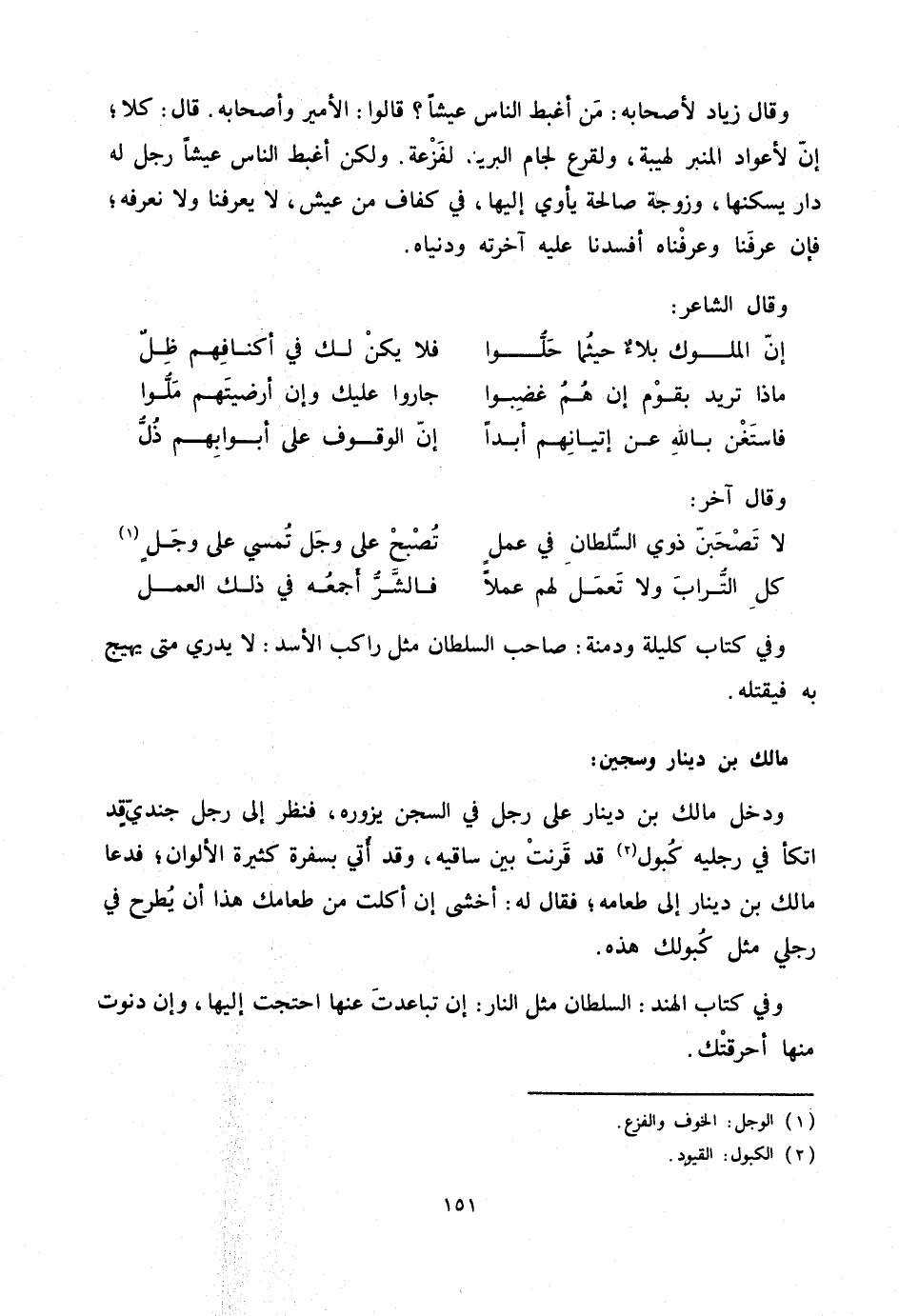 ودخل مالك بن دينار على رجل في السجن يزوره، فنظر إلى رجل جنديّ قد اتكأ في رجليه كبول «2» قد قرنت بين ساقيه، وقد أتي بسفرة كثيرة الألوان؛ فدعا مالك بن دينار إلى طعامه؛ فقال له: أخشى إن أكلت من طعامك هذا أن يطرح في رجلي مثل كبولك هذه.