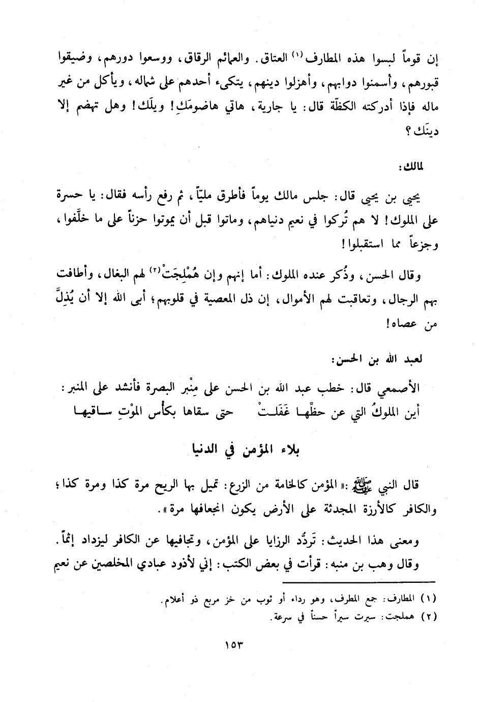إن قوما لبسوا هذه المطارف «1» العتاق. والعمائم الرقاق، ووسعوا دورهم، وضيقوا قبورهم، وأسمنوا دوابهم، وأهزلوا دينهم، يتكىء أحدهم على شماله، ويأكل من غير ماله فإذا أدركته الكظّة قال: يا جارية، هاتي هاضومك! ويلك! وهل تهضم إلا دينك؟