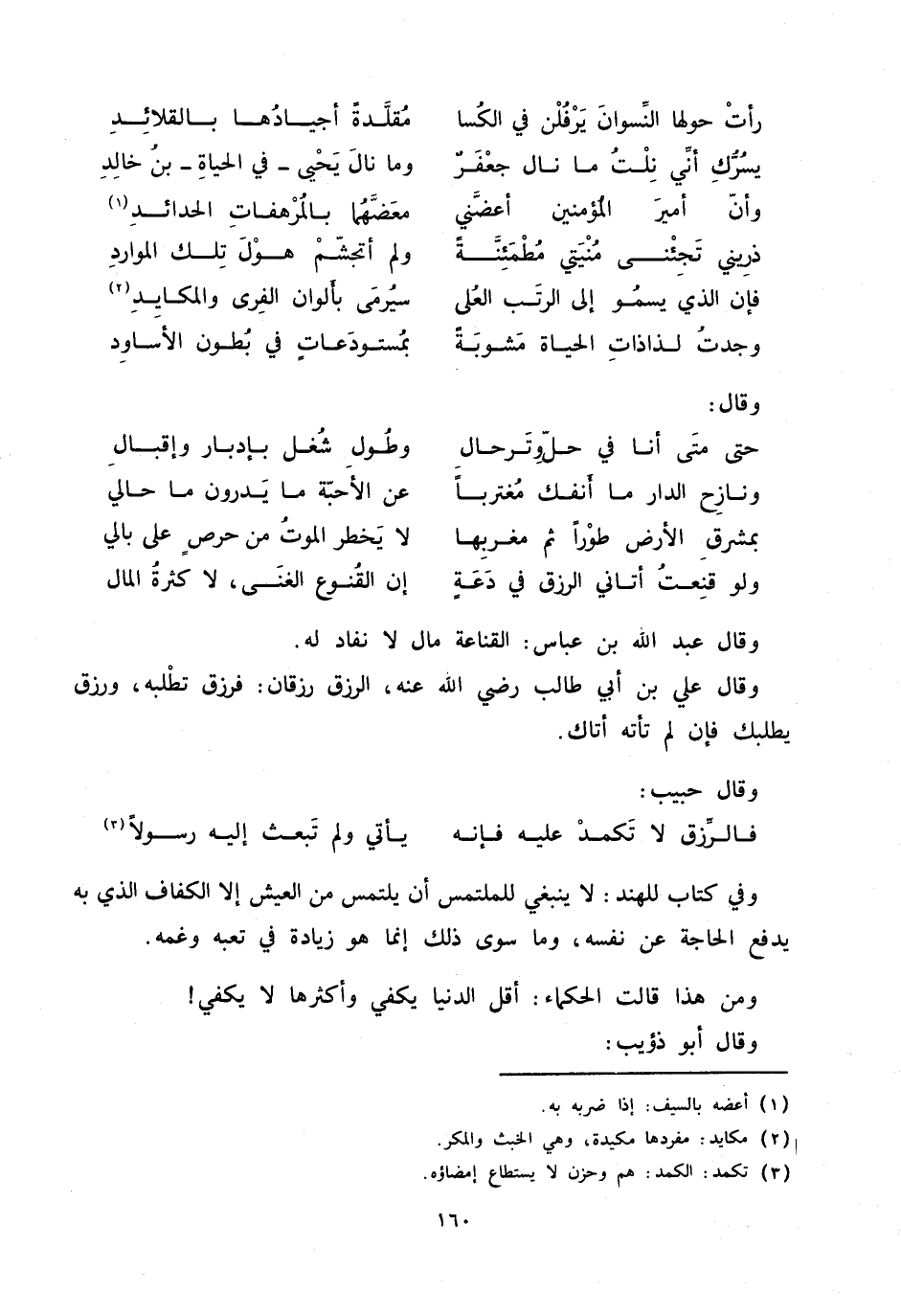 ومن هذا قالت الحكماء: أقل الدنيا يكفي وأكثرها لا يكفي! وقال أبو ذؤيب: