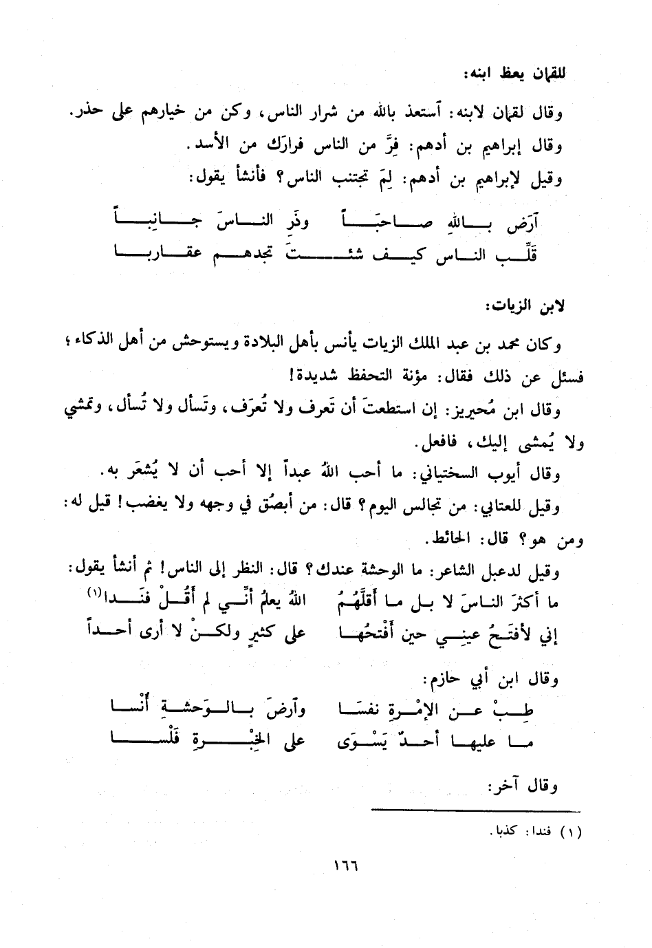 وكان محمد بن عبد الملك الزيات يأنس بأهل البلادة ويستوحش من أهل الذكاء؛ فسئل عن ذلك فقال: مؤنة التحفظ شديدة! وقال ابن محيريز: إن استطعت أن تعرف ولا تعرف، وتسأل ولا تسأل، وتمشي ولا يمشى إليك، فافعل.