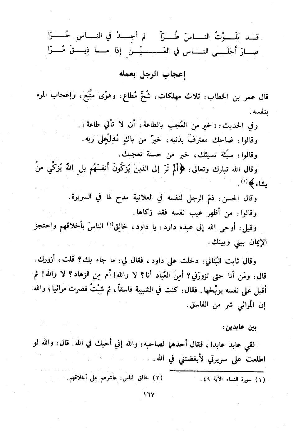 وقال الله تبارك وتعالى: أَلَمْ تَرَ إِلَى الَّذِينَ يُزَكُّونَ أَنْفُسَهُمْ بَلِ اللَّهُ يُزَكِّي مَنْ يَشاءُ
