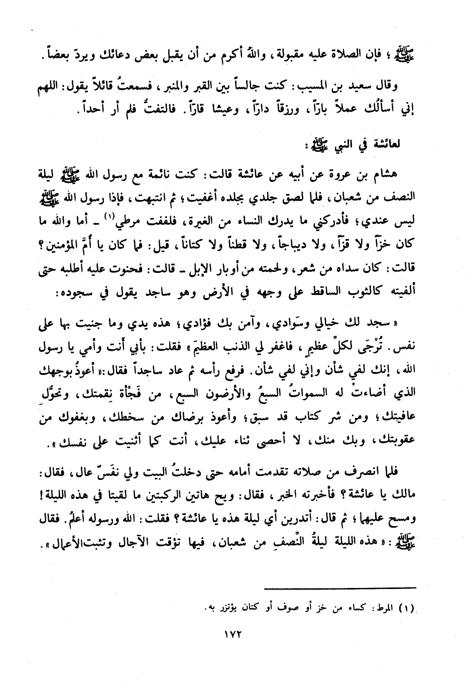 هشام بن عروة عن أبيه عن عائشة قالت: كنت نائمة مع رسول الله صلّى الله عليه وسلم ليلة النصف من شعبان، فلما لصق جلدي بجلده أغفيت؛ ثم انتبهت، فإذا رسول الله صلّى الله عليه وسلم ليس عندي؛ فأدركني ما يدرك النساء من الغيرة، فلففت مرطي «1» - أما والله ما كان خزّا ولا قزّا، ولا ديباجا، ولا قطنا ولا كتانا، قيل: فما كان يا أمّ المؤمنين؟