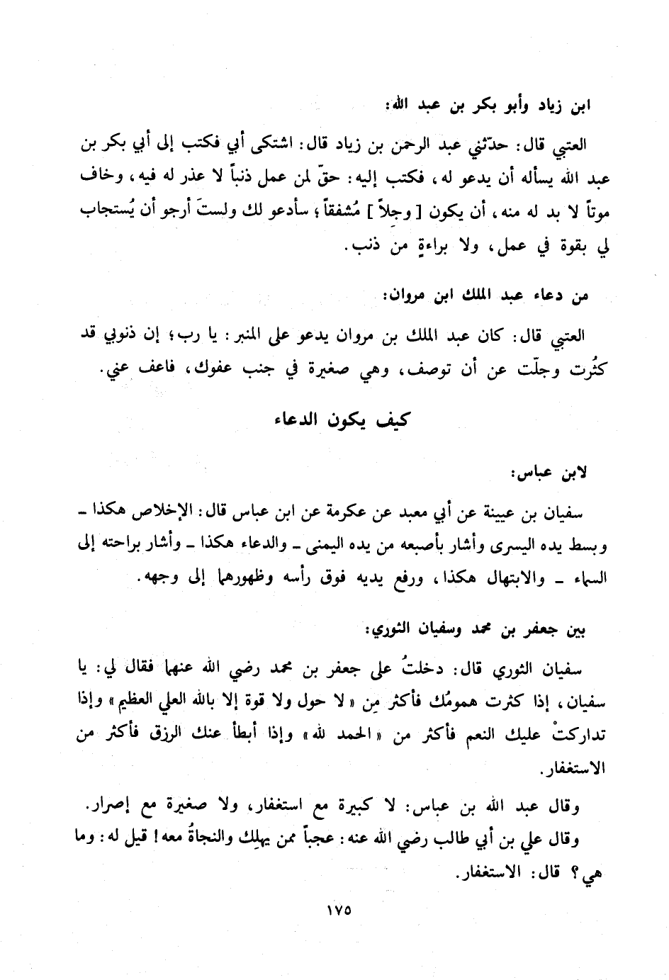 سفيان بن عيينة عن أبي معبد عن عكرمة عن ابن عباس قال: الإخلاص هكذا- وبسط يده اليسرى وأشار بأصبعه من يده اليمنى- والدعاء هكذا- وأشار براحته إلى السماء- والابتهال هكذا، ورفع يديه فوق رأسه وظهورهما إلى وجهه.