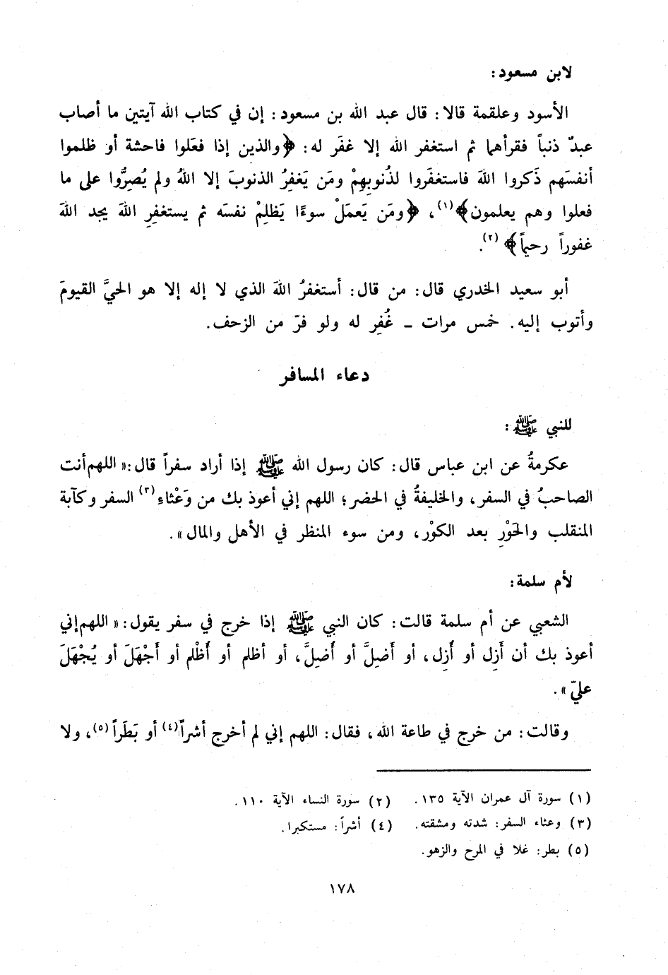 الأسود وعلقمة قالا: قال عبد الله بن مسعود: إن في كتاب الله آيتين ما أصاب عبد ذنبا فقرأهما ثم استغفر الله إلا غفر له: وَالَّذِينَ إِذا فَعَلُوا فاحِشَةً أَوْ ظَلَمُوا أَنْفُسَهُمْ ذَكَرُوا اللَّهَ فَاسْتَغْفَرُوا لِذُنُوبِهِمْ وَمَنْ يَغْفِرُ الذُّنُوبَ إِلَّا اللَّهُ وَلَمْ يُصِرُّوا عَلى ما فَعَلُوا وَهُمْ يَعْلَمُونَ