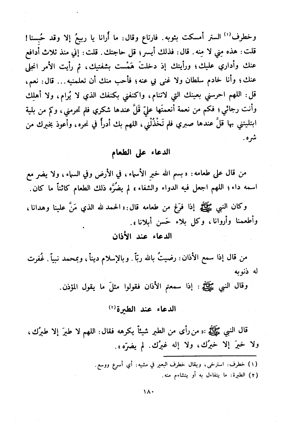 «2» قال النبي صلّى الله عليه وسلم: «من رأى من الطير شيئا يكرهه فقال: اللهم لا طير إلا طيرك، ولا خير إلا خيرك، ولا إله غيرك. لم يضرّه» .