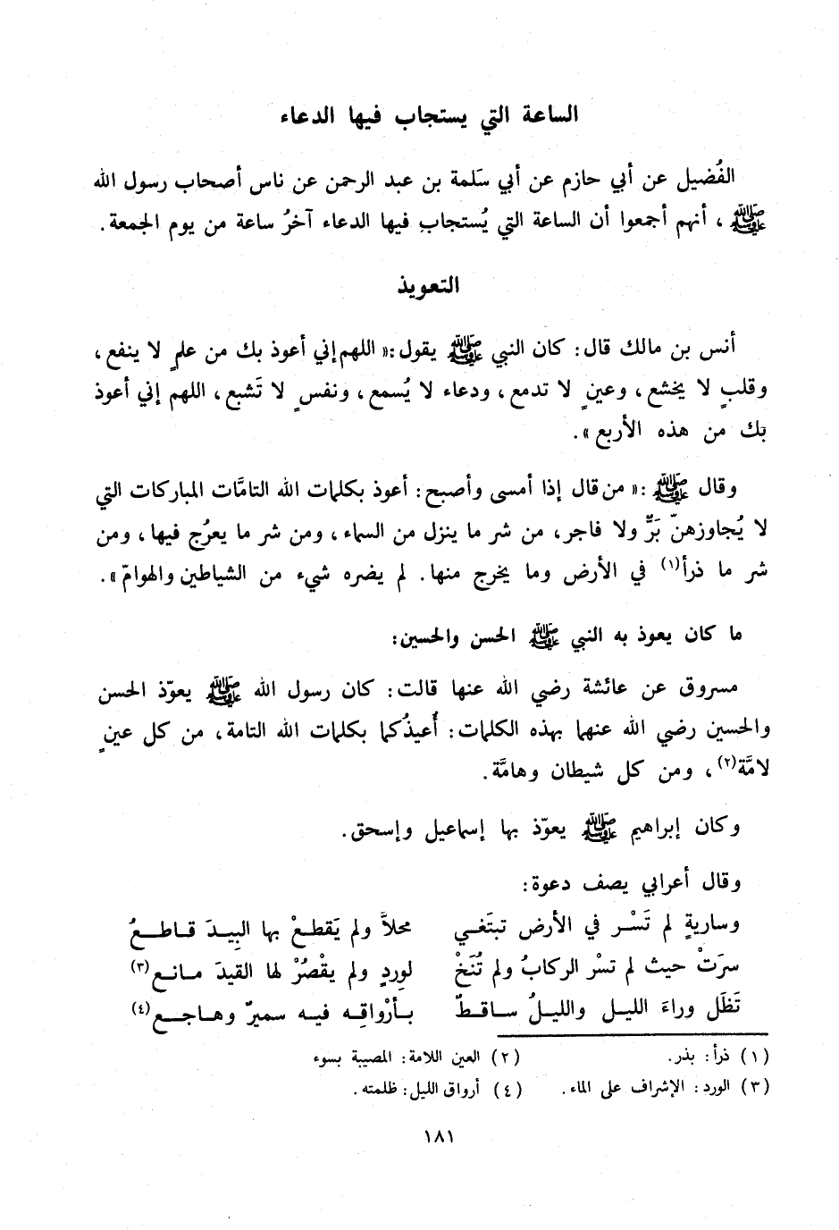 أنس بن مالك قال: كان النبي صلّى الله عليه وسلم يقول: «اللهم إني أعوذ بك من علم لا ينفع، وقلب لا يخشع، وعين لا تدمع، ودعاء لا يسمع، ونفس لا تشبع، اللهم إني أعوذ بك من هذه الأربع» .