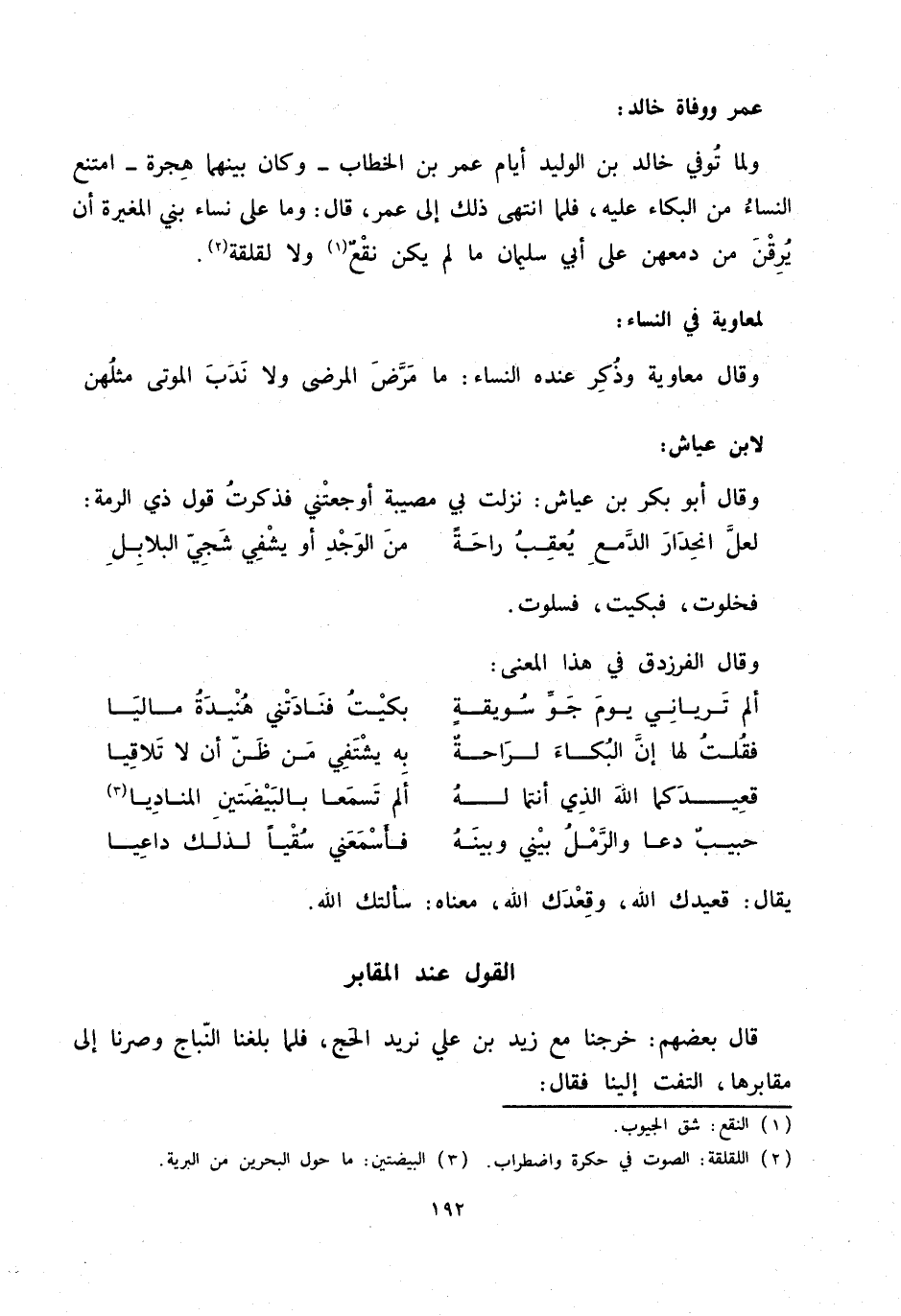 ولما توفي خالد بن الوليد أيام عمر بن الخطاب- وكان بينهما هجرة- امتنع النساء من البكاء عليه، فلما انتهى ذلك إلى عمر، قال: وما على نساء بني المغيرة أن يرقن من دمعهن على أبي سليمان ما لم يكن نقع»