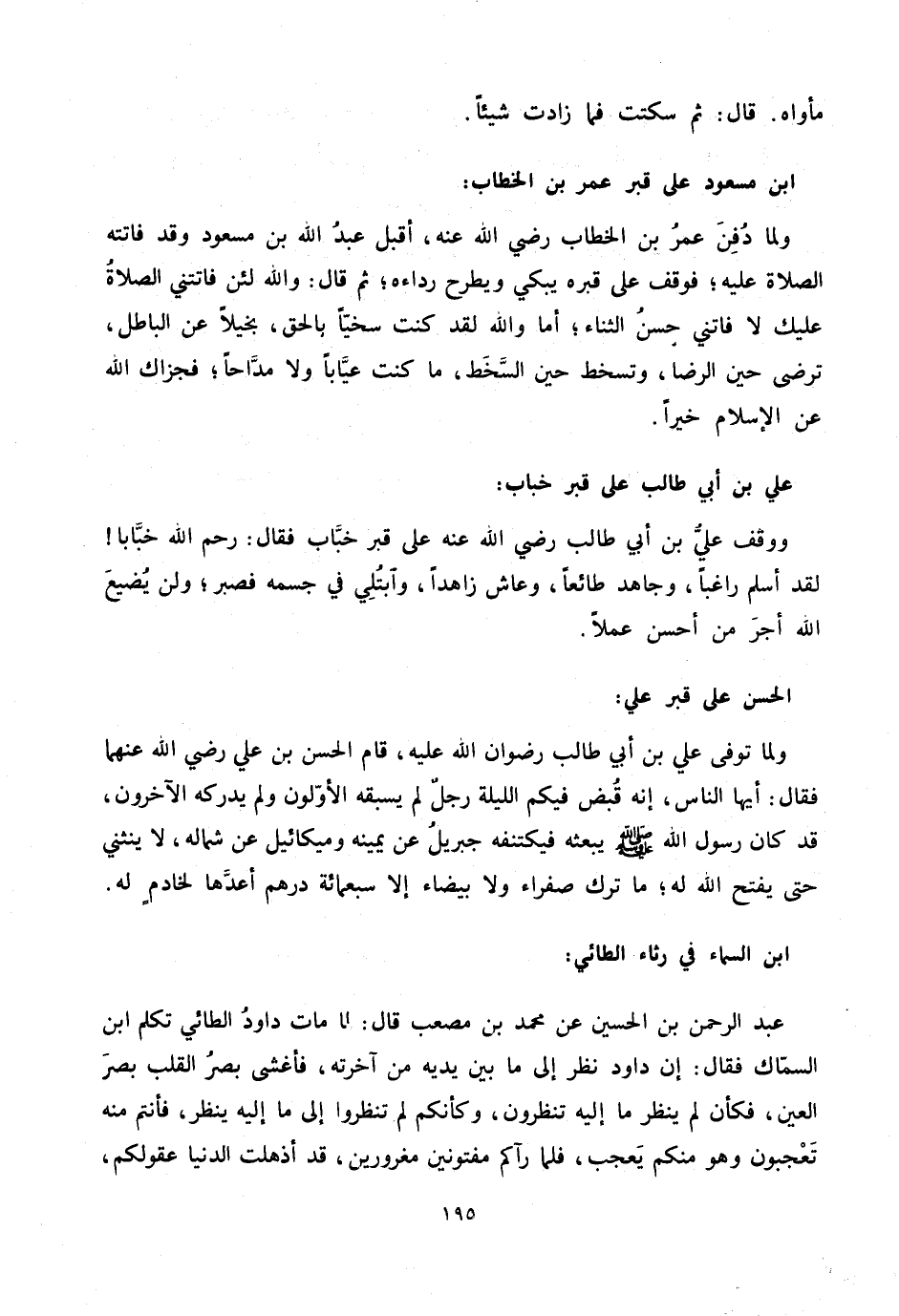 ولما دفن عمر بن الخطاب رضي الله عنه، أقبل عبد الله بن مسعود وقد فاتته الصلاة عليه؛ فوقف على قبره يبكي ويطرح رداءه؛ ثم قال: والله لئن فاتتني الصلاة عليك لا فاتني حسن الثناء؛ أما والله لقد كنت سخيّا بالحق، بخيلا عن الباطل، ترضى حين الرضا، وتسخط حين السّخط، ما كنت عيّابا ولا مدّاحا؛ فجزاك الله عن الإسلام خيرا.
