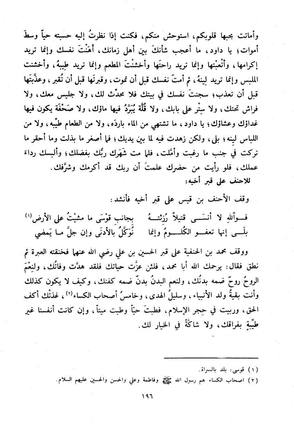 ووقف محمد بن الحنفية على قبر الحسين بن علي رضي الله عنهما فخنقته العبرة ثم نطق فقال: يرحمك الله أبا محمد، فلئن عزّت حياتك فلقد هدّت وفاتك، ولنعم الروح روح ضمه بدنك، ولنعم البدن بدن ضمه كفنك، وكيف لا يكون كذلك وأنت بقية ولد الأنبياء، وسليل الهدى، وخامس أصحاب الكساء «2» ، غذتك أكف الحق، وربيت في حجر الإسلام، فطبت حيّا وطبت ميتا، وإن كانت أنفسنا غير طيّبة بفراقك، ولا شاكّة في الخيار لك.