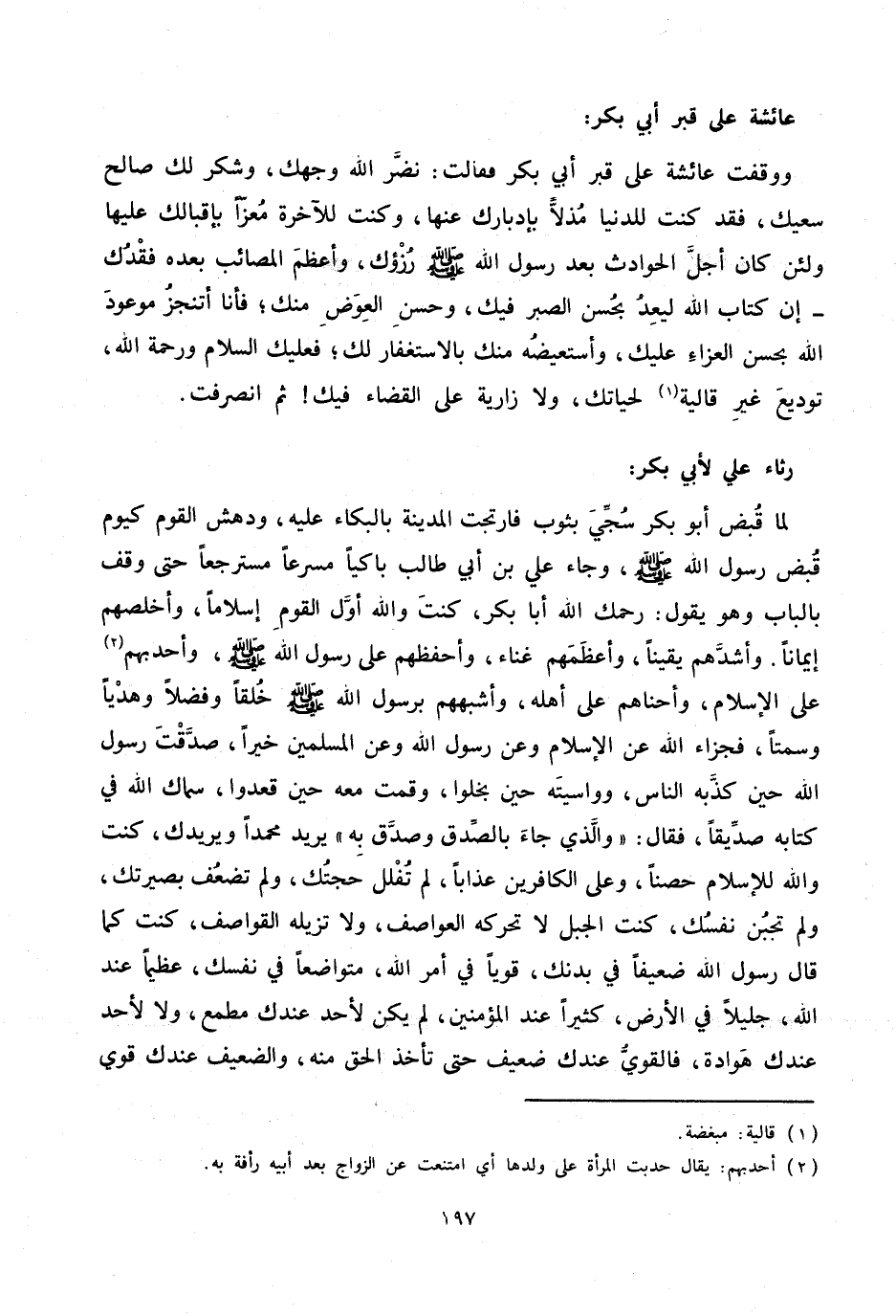 ووقفت عائشة على قبر أبي بكر فقالت: نضّر الله وجهك، وشكر لك صالح سعيك، فقد كنت للدنيا مذلّا بإدبارك عنها، وكنت للآخرة معزّا بإقبالك عليها ولئن كان أجلّ الحوادث بعد رسول الله صلّى الله عليه وسلم رزؤك، وأعظم المصائب بعده فقدك- إن كتاب الله ليعد بحسن الصبر فيك، وحسن العوض منك؛ فأنا أتنجز موعود الله بحسن العزاء عليك، وأستعيضه منك بالاستغفار لك؛ فعليك السلام ورحمة الله، توديع غير قالية «1» لحياتك، ولا زارية على القضاء فيك! ثم انصرفت.