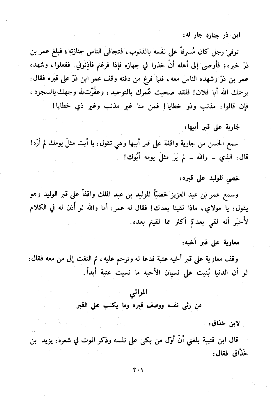وسمع عمر بن عبد العزيز خصيّا للوليد بن عبد الملك واقفا على قبر الوليد وهو يقول: يا مولاي، ماذا لقينا بعدك! فقال له عمر: أما والله لو أذن له في الكلام لأخبر أنه لقي بعدكم أكثر مما لقيتم بعده.