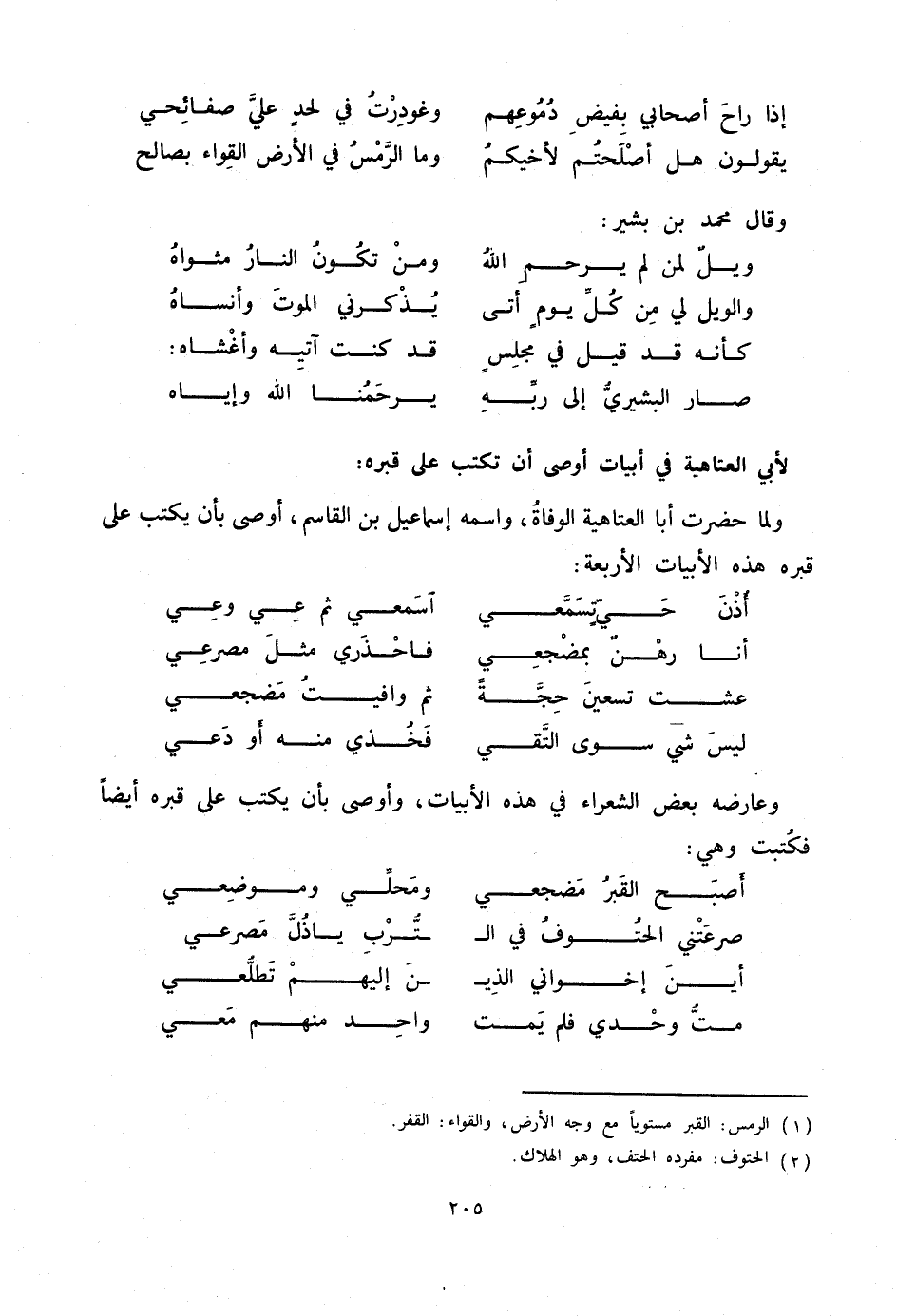 ولما حضرت أبا العتاهية الوفاة، واسمه إسماعيل بن القاسم، أوصى بأن يكتب على قبره هذه الأبيات الأربعة: