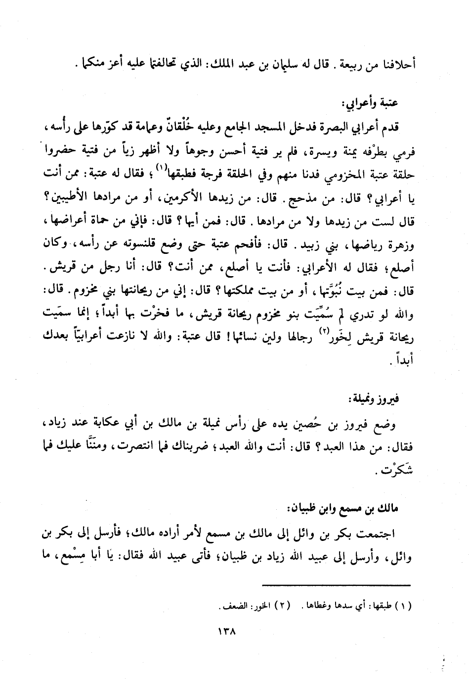 قال لست من زيدها ولا من مرادها. قال: فمن أيها؟ قال: فإني من حماة أعراضها، وزهرة رياضها، بني زبيد. قال: فأفحم عتبة حتى وضع قلنسوته عن رأسه، وكان أصلع؛ فقال له الأعرابي: فأنت يا أصلع، ممن أنت؟ قال: أنا رجل من قريش.