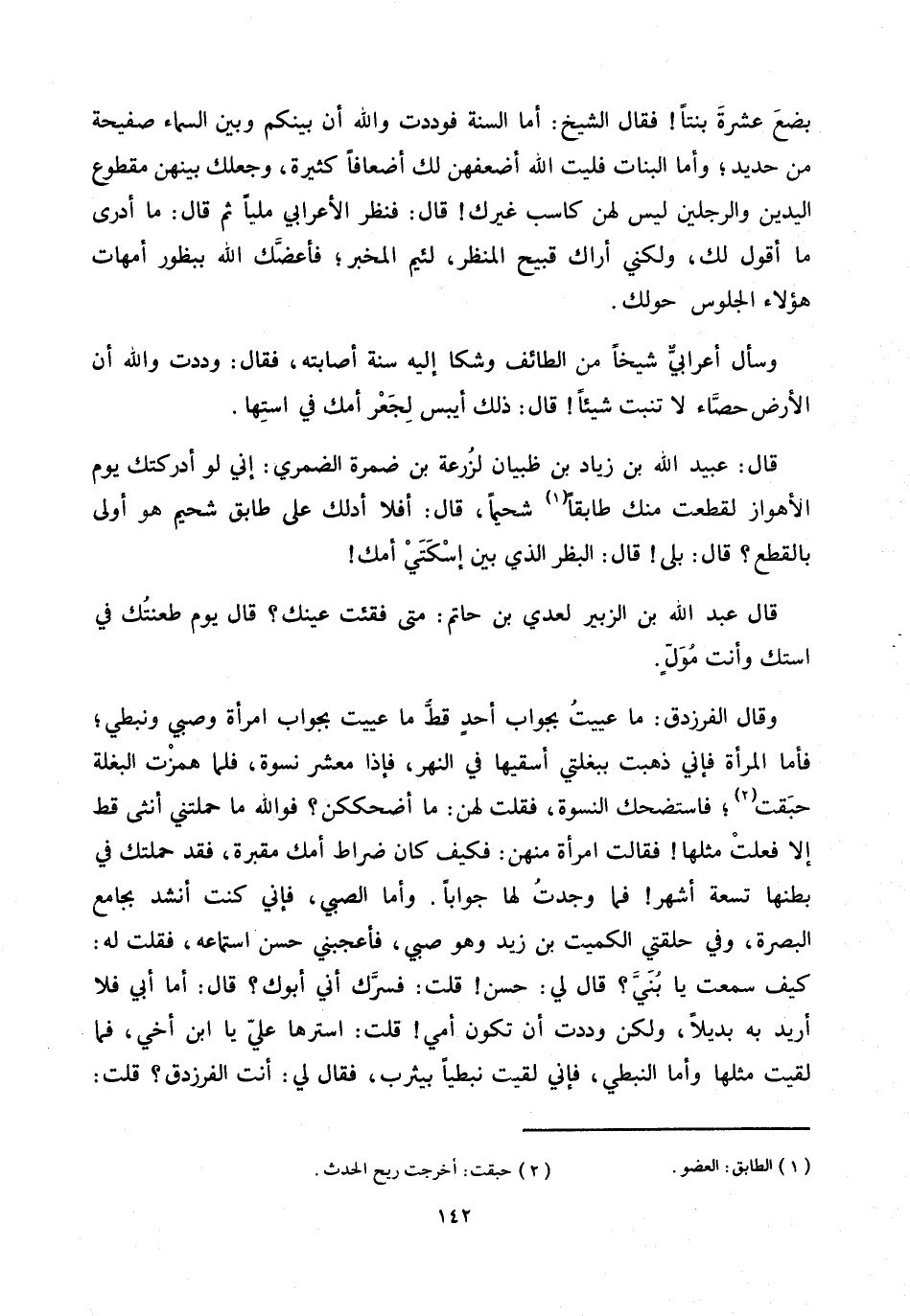 بضع عشرة بنتا! فقال الشيخ: أما السنة فوددت والله أن بينكم وبين السماء صفيحة من حديد؛ وأما البنات فليت الله أضعفهن لك أضعافا كثيرة، وجعلك بينهن مقطوع اليدين والرجلين ليس لهن كاسب غيرك! قال: فنظر الأعرابي مليا ثم قال: ما أدرى ما أقول لك، ولكني أراك قبيح المنظر، لئيم المخبر؛ فأعضّك الله ببظور أمهات هؤلاء الجلوس حولك.