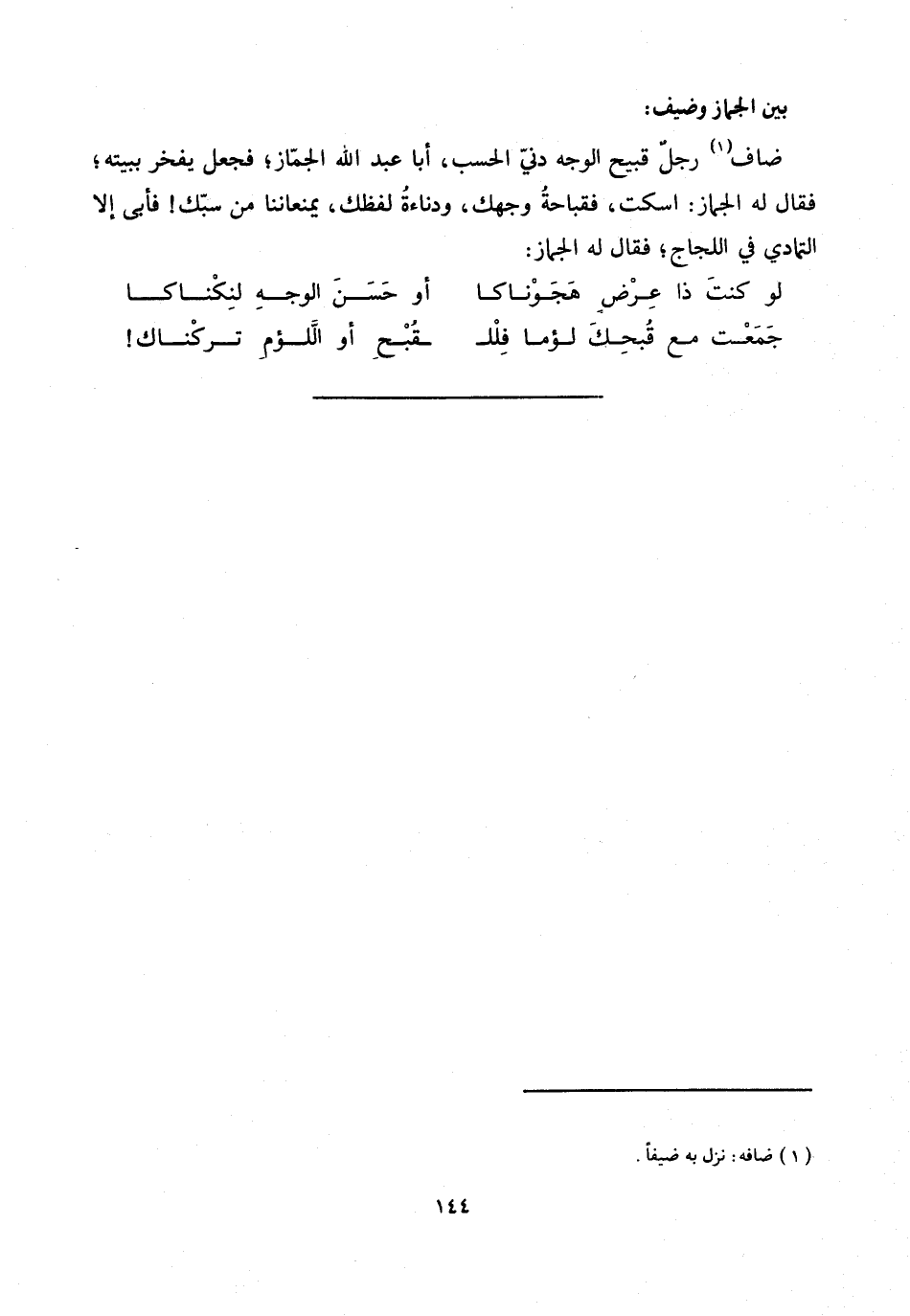 ضاف «1» رجل قبيح الوجه دنيّ الحسب، أبا عبد الله الجمّاز: فجعل يفخر ببيته؛ فقال له الجماز: اسكت، فقباحة وجهك، ودناءة لفظك، يمنعاننا من سبّك! فأبى إلا التمادي في اللجاج؛ فقال له الجماز: