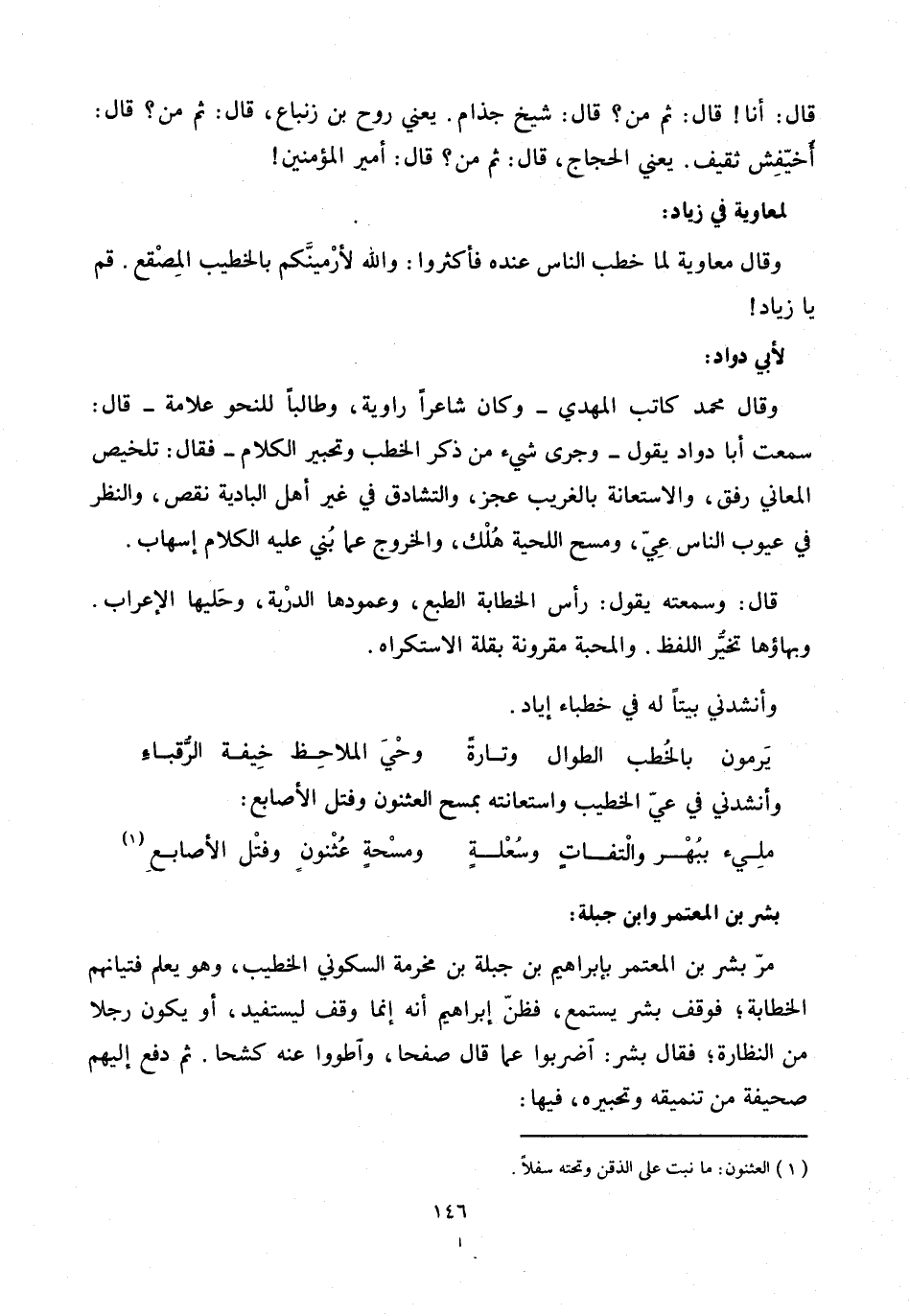 سمعت أبا دواد يقول- وجرى شيء من ذكر الخطب وتحبير الكلام- فقال: تلخيص المعاني رفق، والاستعانة بالغريب عجز، والتشادق في غير أهل البادية نقص، والنظر في عيوب الناس عيّ، ومسح اللحية هلك، والخروج عما بني عليه الكلام إسهاب.