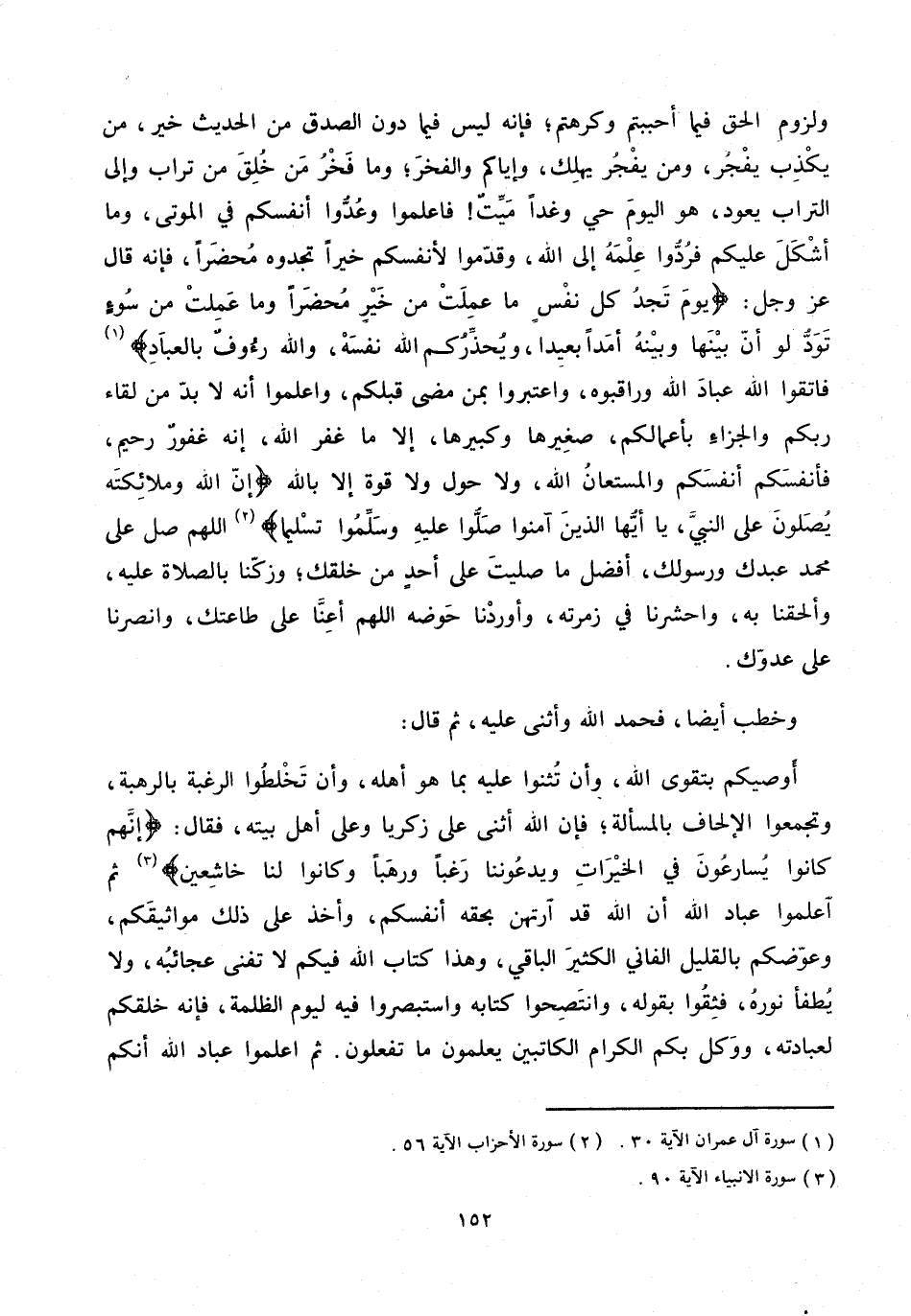 «1» فاتقوا الله عباد الله وراقبوه، واعتبروا بمن مضى قبلكم، واعلموا أنه لا بدّ من لقاء ربكم والجزاء بأعمالكم، صغيرها وكبيرها، إلا ما غفر الله، إنه غفور رحيم، فأنفسكم أنفسكم والمستعان الله، ولا حول ولا قوة إلا بالله إِنَّ اللَّهَ وَمَلائِكَتَهُ يُصَلُّونَ عَلَى النَّبِيِّ، يا أَيُّهَا الَّذِينَ آمَنُوا صَلُّوا عَلَيْهِ وَسَلِّمُوا تَسْلِيماً