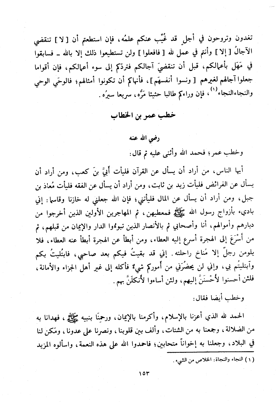 أيها الناس، من أراد أن يسأل عن القرآن فليأت أبيّ بن كعب، ومن أراد أن يسأل عن الفرائض فليأت زيد بن ثابت، ومن أراد أن يسأل عن الفقه فليأت معاذ بن جبل، ومن أراد أن يسأل عن المال فليأتني؛ فإن الله جعلني له خازنا وقاسما: إني باديء بأزواج رسول الله صلّى الله عليه وسلم فمعطيهن، ثم المهاجرين الأولين الذين أخرجوا من ديارهم وأموالهم، أنا وأصحابي ثم بالأنصار الذين تبوءوا الدار والإيمان من قبلهم، ثم من أسرع إلى الهجرة أسرع إليه العطاء، ومن أبطأ عن الهجرة أبطأ عن الهجرة أبطأ عنه العطاء، فلا يلومن رجل إلا مناخ راحلته. إني قد بقيت فيكم بعد صاحبي، فابتليت بكم وابتليتم بي، وإني لن يحضرني من أموركم شيء فأكله إلى غير أهل الجزاء والأمانة، فلئن أحسنوا لأحسننّ إليهم، ولئن أساءوا لأنكلنّ بهم.