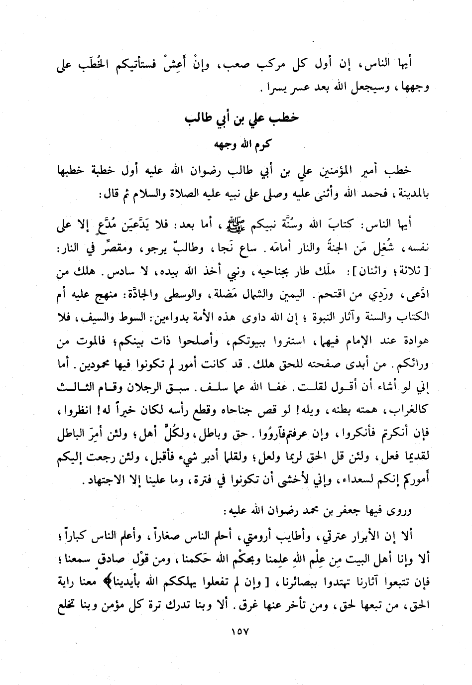 [ثلاثة؛ واثنان] : ملك طار بجناحيه، ونبي أخذ الله بيده، لا سادس. هلك من ادّعى، وردي من اقتحم. اليمين والشمال مضلة، والوسطى والجادّة: منهج عليه أم الكتاب والسنة وآثار النبوة؛ إن الله داوى هذه الأمة بدواءين: السوط والسيف، فلا هوادة عند الإمام فيهما، استتروا ببيوتكم، وأصلحوا ذات بينكم؛ فالموت من ورائكم. من أبدى صفحته للحق هلك. قد كانت أمور لم تكونوا فيها محمودين. أما اني لو أشاء أن أقول لقلت. عفا الله عما سلف. سبق الرجلان وقام الثالث كالغراب، همته بطنه، ويله! لو قص جناحاه وقطع رأسه لكان خيرا له! انظروا، فإن أنكرتم فأنكروا، وإن عرفتم فارووا. حق وباطل، ولكلّ أهل؛ ولئن أمر الباطل لقديما فعل، ولئن قل الحق لربما ولعل؛ ولقلما أدبر شيء فأقبل، ولئن رجعت إليكم أموركم إنكم لسعداء، وإني لأخشى أن تكونوا في فترة، وما علينا إلا الاجتهاد.