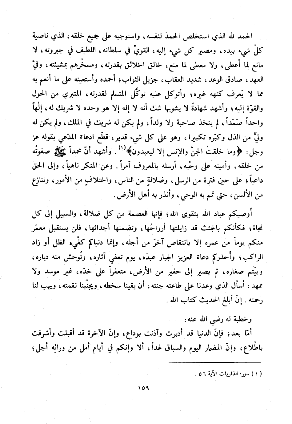 الحمد لله الذي استخلص الحمد لنفسه، واستوجبه على جميع خلقه، الذي ناصية كلّ شيء بيده، ومصير كل شيء إليه، القويّ في سلطانه، اللطيف في جبروته، لا مانع لما أعطى، ولا معطى لما منع، خالق الخلائق بقدرته، ومسخّرهم بمشيئته، وفيّ العهد، صادق الوعد، شديد العقاب، جزيل الثواب؛ أحمده وأستعينه على ما أنعم به مما لا يعرف كنهه غيره؛ وأتوكل عليه توكّل المتسلم لقدرته، المتبري من الحول والقوّة إليه؛ وأشهد شهادة لا يشوبها شك أنه لا إله إلا هو وحده لا شريك له، إلها واحدا صمدا، لم يتخذ صاحبة ولا ولدا، ولم يكن له شريك في الملك، ولم يكن له وليّ من الذل وكبّره تكبيرا، وهو على كل شيء قدير، قطع ادعاء المدّعي بقوله عز وجل: وَما خَلَقْتُ الْجِنَّ وَالْإِنْسَ إِلَّا لِيَعْبُدُونِ