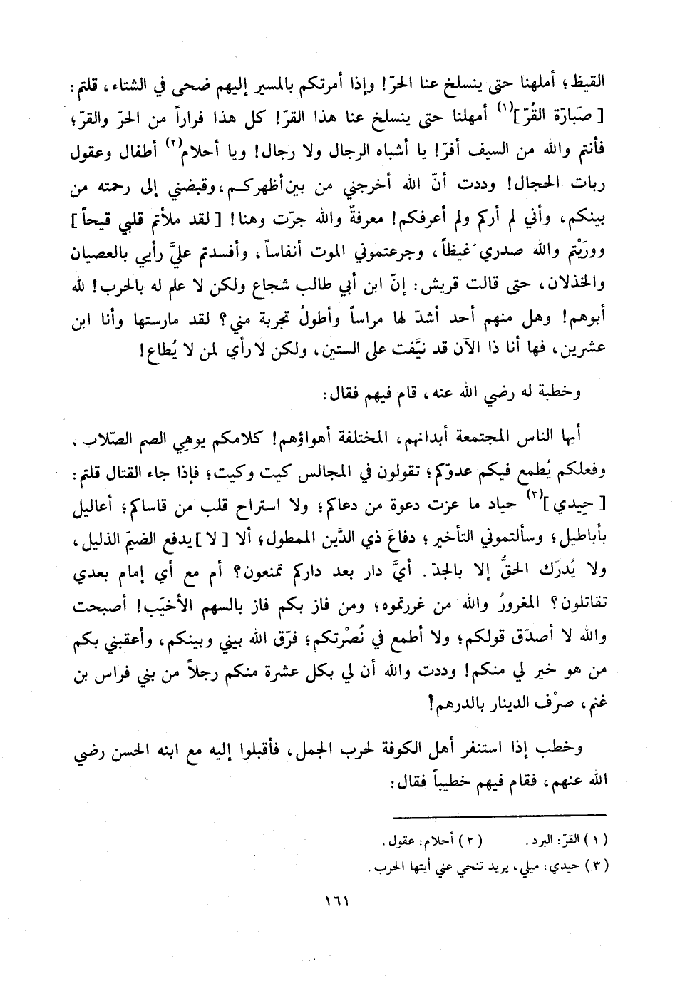[حيدي] «3» حياد ما عزت دعوة من دعاكم؛ ولا استراح قلب من قاساكم؛ أعاليل بأباطيل؛ وسألتموني التأخير؛ دفاع ذي الدّين الممطول؛ ألا [لا] يدفع الضيم الذليل، ولا يدرك الحقّ إلا بالجدّ. أيّ دار بعد داركم تمنعون؟ أم مع أي إمام بعدي تقاتلون؟ المغرور والله من غررتموه؛ ومن فاز بكم فاز بالسهم الأخيب! أصبحت والله لا أصدّق قولكم؛ ولا أطمع في نصرتكم؛ فرّق الله بيني وبينكم، وأعقبني بكم من هو خير لي منكم! وددت والله أن لي بكل عشرة منكم رجلا من بني فراس بن غنم، صرف الدينار بالدرهم! وخطب إذا استنفر أهل الكوفة لحرب الجمل، فأقبلوا إليه مع ابنه الحسن رضي الله عنهم، فقام فيهم خطيبا فقال: