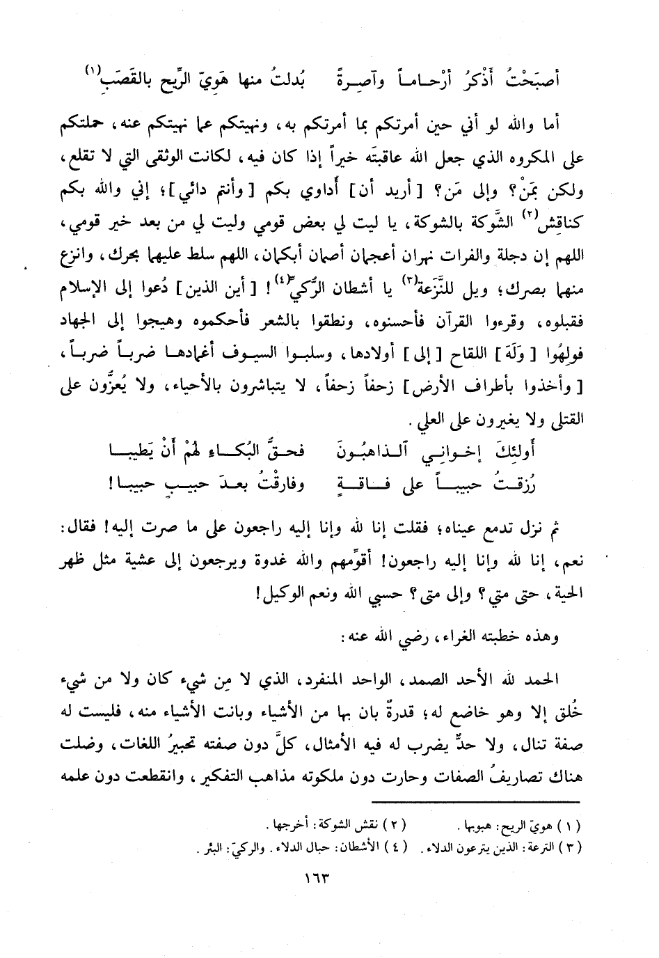 أما والله لو أني حين أمرتكم بما أمرتكم به، ونهيتكم عما نهيتكم عنه، حملتكم على المكروه الذي جعل الله عاقبته خيرا إذا كان فيه، لكانت الوثقى التي لا تقلع، ولكن بمن؟ وإلى من؟ [أريد أن] أداوي بكم [وأنتم دائي] ؛ إني والله بكم كناقش «2» الشّوكة بالشوكة، يا ليت لي بعض قومي وليت لي من بعد خير قومي، اللهم إن دجلة والفرات نهران أعجمان أصمان أبكمان، اللهم سلط عليهما بحرك، وانزع منهما بصرك؛ ويل للنّزعة «3» يا أشطان الرّكيّ «4» ! [أين الذين] دعوا إلى الإسلام فقبلوه، وقرءوا القرآن فأحسنوه، ونطقوا بالشعر فأحكموه وهيجوا إلى الجهاد فولهوا [وله] اللقاح [إلى] أولادها، وسلبوا السيوف أغمادها ضربا ضربا، [وأخذوا بأطراف الأرض] زحفا زحفا، لا يتباشرون بالأحياء، ولا يعزّون على القتلى ولا يغيرون على العلي.