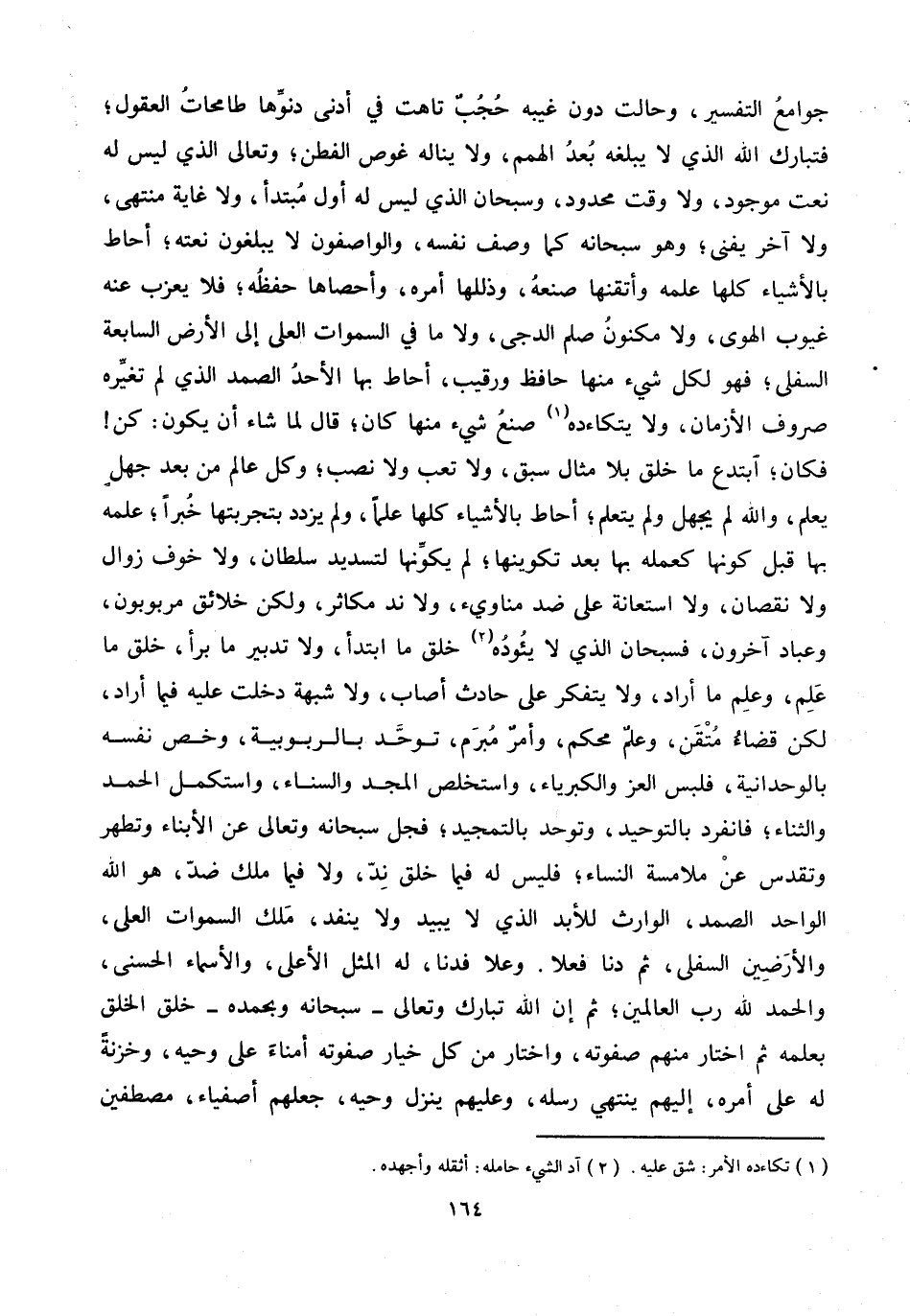 جوامع التفسير، وحالت دون غيبه حجب تاهت في أدنى دنوّها طامحات العقول؛ فتبارك الله الذي لا يبلغه بعد الهمم، ولا يناله غوص الفطن؛ وتعالى الذي ليس له نعت موجود، ولا وقت محدود، وسبحان الذي ليس له أول مبتدأ، ولا غاية منتهى، ولا آخر يفنى؛ وهو سبحانه كما وصف نفسه، والواصفون لا يبلغون نعته؛ أحاط بالأشياء كلها علمه وأتقنها صنعه، وذللها أمره، وأحصاها حفظه؛ فلا يعزب عنه غيوب الهوى، ولا مكنون صلم الدجى، ولا ما في السموات العلى إلى الأرض السابعة السفلى؛ فهو لكل شيء منها حافظ ورقيب، أحاط بها الأحد الصمد الذي لم تغيّره صروف الأزمان، ولا يتكاءده «1» صنع شيء منها كان؛ قال لما شاء أن يكون: كن! فكان؛ ابتدع ما خلق بلا مثال سبق، ولا تعب ولا نصب؛ وكل عالم من بعد جهل يعلم، والله لم يجهل ولم يتعلم؛ أحاط بالأشياء كلها علما، ولم يزدد بتجربتها خبرا؛ علمه بها قبل كونها كعمله بها بعد تكوينها؛ لم يكوّنها لتسديد سلطان، ولا خوف زوال ولا نقصان، ولا استعانة على ضد مناويء، ولا ند مكاثر، ولكن خلائق مربوبون، وعباد آخرون، فسبحان الذي لا يئوده «2» خلق ما ابتدأ، ولا تدبير ما برأ، خلق ما علم، وعلم ما أراد، ولا يتفكر على حادث أصاب، ولا شبهة دخلت عليه فيما أراد، لكن قضاء متقن، وعلم محكم، وأمر مبرم، توحّد بالربوبية، وخص نفسه بالوحدانية، فلبس العز والكبرياء، واستخلص المجد والسناء، واستكمل الحمد والثناء؛ فانفرد بالتوحيد، وتوحد بالتمجيد؛ فجل سبحانه وتعالى عن الأبناء وتطهر وتقدس عن ملامسة النساء؛ فليس له فيما خلق ندّ، ولا فيما ملك ضدّ، هو الله الواحد الصمد، الوارث للأبد الذي لا يبيد ولا ينفد، ملك السموات العلى، والأرضين السفلى، ثم دنا فعلا. وعلا فدنا، له المثل الأعلى، والأسماء الحسنى، والحمد لله رب العالمين؛ ثم إن الله تبارك وتعالى- سبحانه وبحمده- خلق الخلق بعلمه ثم اختار منهم صفوته، واختار من كل خيار صفوته أمناء على وحيه، وخزنة له على أمره، إليهم ينتهي رسله، وعليهم ينزل وحيه، جعلهم أصفياء، مصطفين
