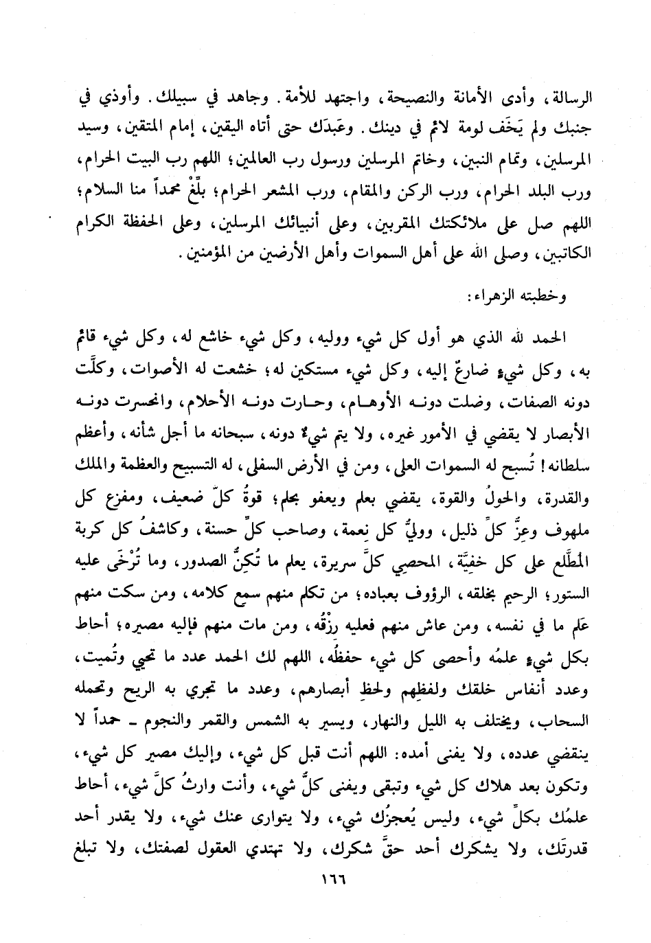 الحمد لله الذي هو أول كل شيء ووليه، وكل شيء خاشع له، وكل شيء قائم به، وكل شيء ضارع إليه، وكل شيء مستكين له؛ خشعت له الأصوات، وكلّت دونه الصفات، وضلت دونه الأوهام، وحارت دونه الأحلام، وانحسرت دونه الأبصار لا يقضي في الأمور غيره، ولا يتم شيء دونه، سبحانه ما أجل شأنه، وأعظم سلطانه! تسبح له السموات العلى، ومن في الأرض السفلى، له التسبيح والعظمة والملك والقدرة، والحول والقوة، يقضي بعلم ويعفو بحلم؛ قوة كلّ ضعيف، ومفزع كل ملهوف وعزّ كلّ ذليل، ووليّ كل نعمة، وصاحب كلّ حسنة، وكاشف كل كربة المطّلع على كل خفيّة، المحصي كلّ سريرة، يعلم ما تكنّ الصدور، وما ترخى عليه الستور؛ الرحيم بخلقه، الرؤوف بعباده؛ من تكلم منهم سمع كلامه، ومن سكت منهم علم ما في نفسه، ومن عاش منهم فعليه رزقه، ومن مات منهم فإليه مصيره؛ أحاط بكل شيء علمه وأحصى كل شيء حفظه، اللهم لك الحمد عدد ما تحيي وتميت، وعدد أنفاس خلقك ولفظهم ولحظ أبصارهم، وعدد ما تجري به الريح وتحمله السحاب، ويختلف به الليل والنهار، ويسير به الشمس والقمر والنجوم- حمدا لا ينقضي عدده، ولا يفنى أمده: اللهم أنت قبل كل شيء، وإليك مصير كل شيء، وتكون بعد هلاك كل شيء وتبقى ويفنى كلّ شيء، وأنت وارث كلّ شيء، أحاط علمك بكلّ شيء، وليس يعجزك شيء، ولا يتوارى عنك شيء، ولا يقدر أحد قدرتك، ولا يشكرك أحد حقّ شكرك، ولا تهتدي العقول لصفتك، ولا تبلغ
