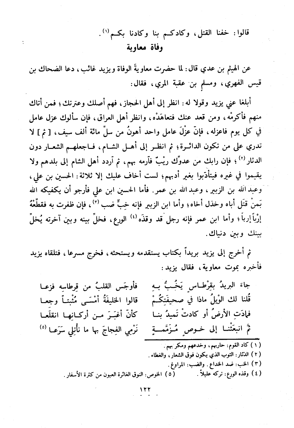 أبلغا عني يزيد وقولا له: انظر إلى أهل الحجاز، فهم أصلك وعترتك؛ فمن أتاك منهم فأكرمه، ومن قعد عنك فتعاهده، وانظر أهل العراق، فإن سألوك عزل عامل في كل يوم فاعزله، فإنّ عزل عامل واحد أهون من سلّ مائة ألف سيف، [ثم] لا تدري على من تكون الدائرة؛ ثم انظر إلى أهل الشام، فاجعلهم الشعار دون الدثار «2» ؛ فإن رابك من عدوّك ريب فارمه بهم، ثم اردد أهل الشام إلى بلدهم ولا يقيموا في غيره فيتأدّبوا بغير أدبهم؛ لست أخاف عليك إلا ثلاثة: الحسين بن علي، وعبد الله بن الزبير، وعبد الله بن عمر. فأما الحسين ابن علي فأرجو أن يكفيكه الله بمن قتل أباه وخذل أخاه؛ وأما ابن الزبير فإنه خبّ ضب «3» ، فإن ظفرت به فقطّعه إربا إربا؛ وأما ابن عمر فإنه رجل قد وقذه «4» الورع، فخلّ بينه وبين آخرته يخلّ بينك وبين دنياك.