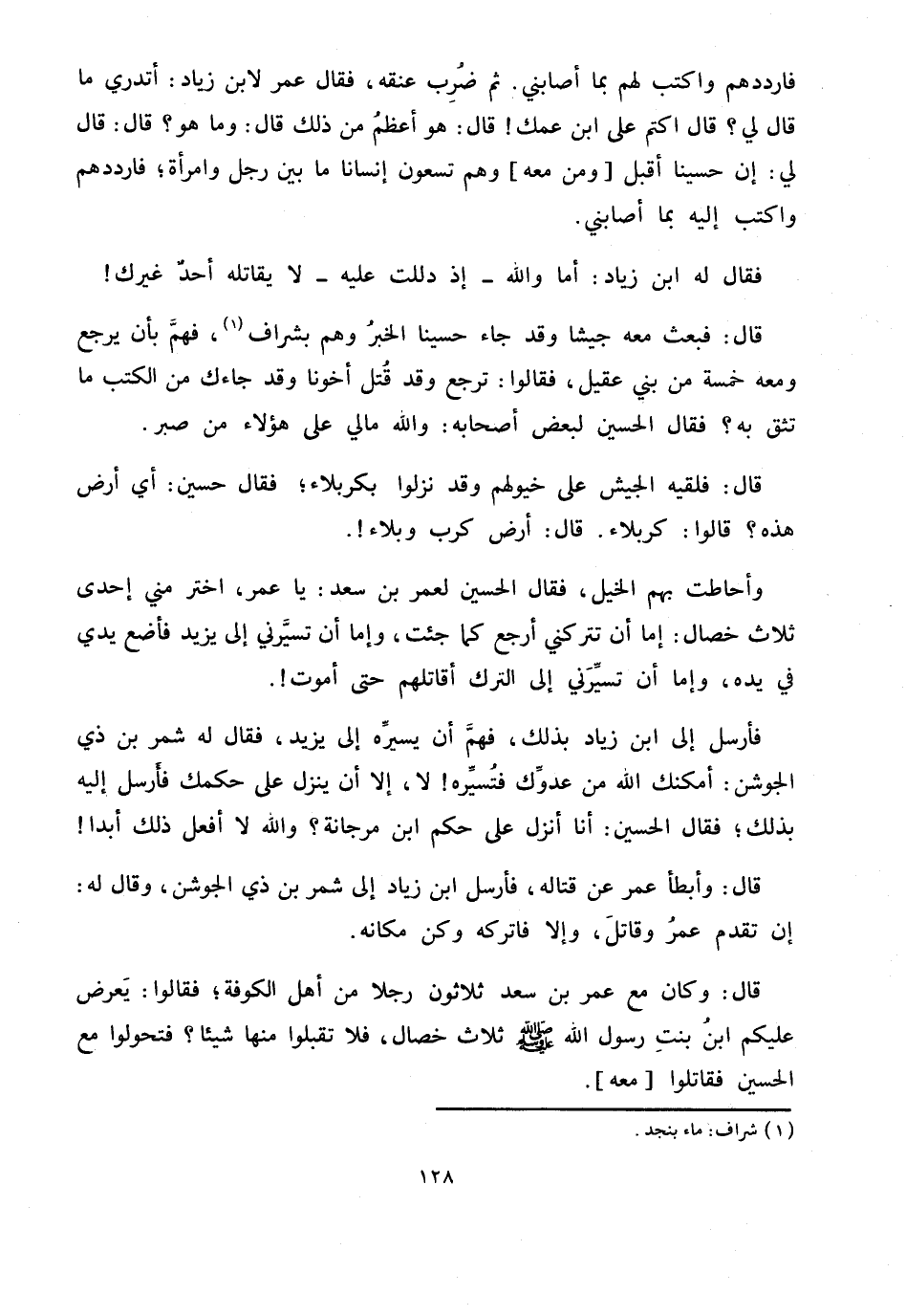 وأحاطت بهم الخيل، فقال الحسين لعمر بن سعد: يا عمر، اختر مني إحدى ثلاث خصال: إما أن تتركني أرجع كما جئت، وإما أن تسيّرني إلى يزيد فأضع يدي في يده، وإما أن تسيّرني إلى الترك أقاتلهم حتى أموت!.