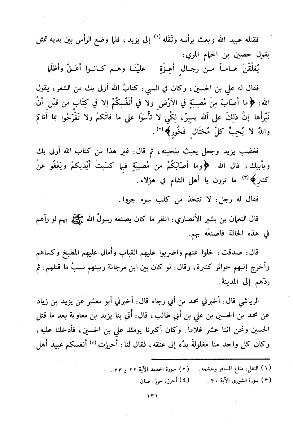 فغضب يزيد وجعل يعبث بلحيته، ثم قال: غير هذا من كتاب الله أولى بك وبأبيك، قال الله. وَما أَصابَكُمْ مِنْ مُصِيبَةٍ فَبِما كَسَبَتْ أَيْدِيكُمْ وَيَعْفُوا عَنْ كَثِيرٍ