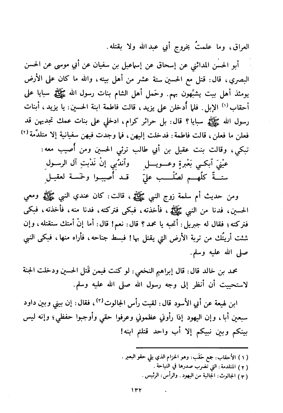 أبو الحسن المدائني عن إسحاق عن إسماعيل بن سفيان عن أبي موسى عن الحسن البصري، قال: قتل مع الحسين ستة عشر من أهل بيته، والله ما كان على الأرض يومئذ أهل بيت يشبّهون بهم. وحمل أهل الشام بنات رسول الله صلّى الله عليه وسلم سبايا على أحقاب «1» الإبل. فلما أدخلن على يزيد، قالت فاطمة ابنة الحسين: يا يزيد، أبنات رسول الله صلّى الله عليه وسلم سبايا؟ قال: بل حرائر كرام، ادخلي على بنات عمك تجديهن قد فعلن ما فعلن، قالت فاطمة: فدخلت إليهن، فما وجدت فيهن سفيانية إلا متلدّمة «2» تبكي، وقالت بنت عقيل بن أبي طالب ترثي الحسين ومن أصيب معه: