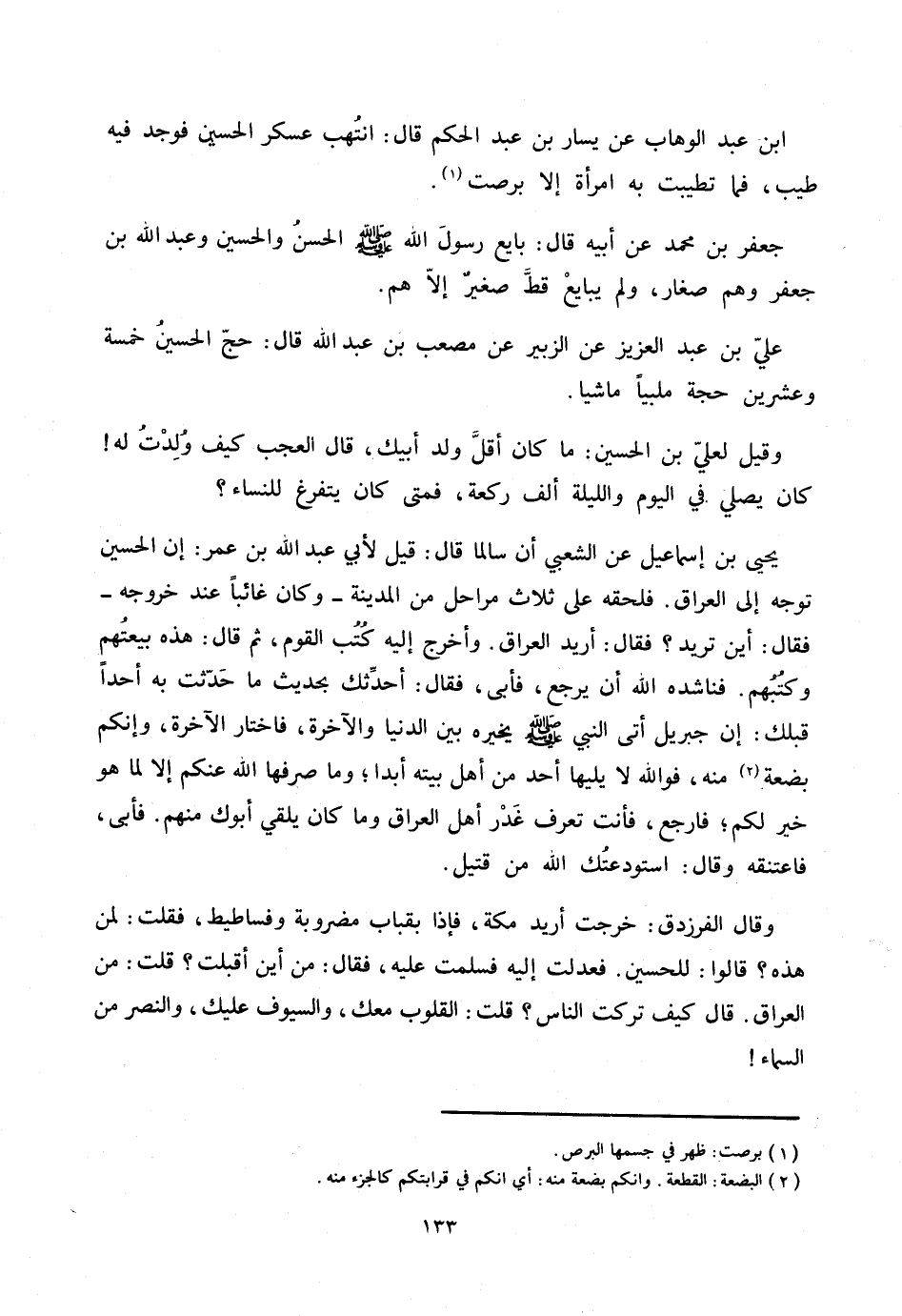 عليّ بن عبد العزيز عن الزبير عن مصعب بن عبد الله قال: حجّ الحسين خمسة وعشرين حجة ملبيا ماشيا.