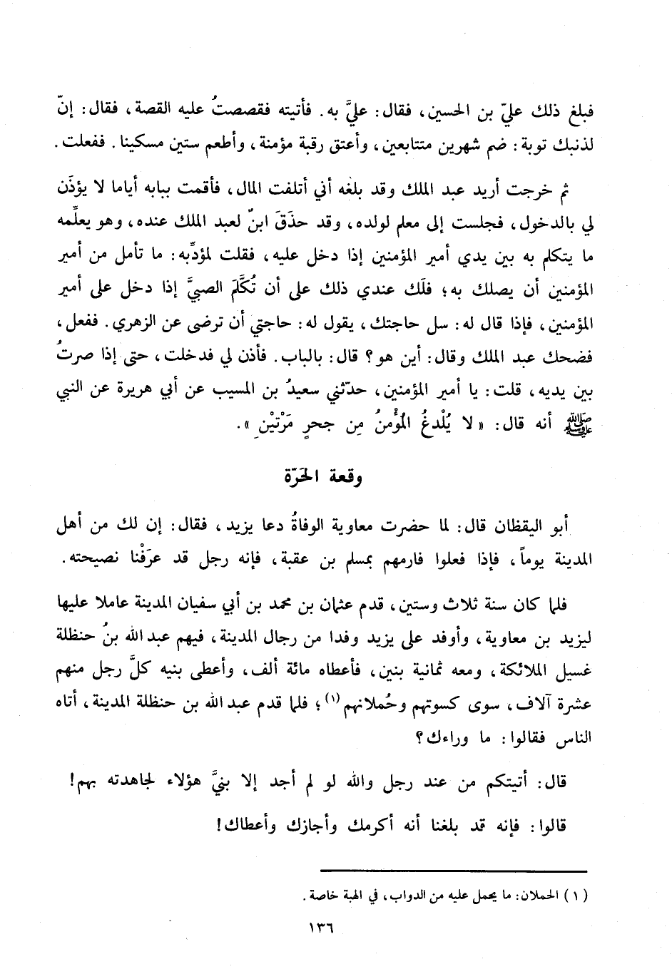 ثم خرجت أريد عبد الملك وقد بلغه أني أتلفت المال، فأقمت ببابه أياما لا يؤذن لي بالدخول، فجلست إلى معلم لولده، وقد حذق ابن لعبد الملك عنده، وهو يعلّمه ما يتكلم به بين يدي أمير المؤمنين إذا دخل عليه، فقلت لمؤدّبه: ما تأمل من أمير المؤمنين أن يصلك به؛ فلك عندي ذلك على أن تكلّم الصبيّ إذا دخل على أمير المؤمنين، فإذا قال له: سل حاجتك، يقول له: حاجتي أن ترضى عن الزهري. ففعل، فضحك عبد الملك وقال: أين هو؟ قال: بالباب. فأذن لي فدخلت، حتى إذا صرت بين يديه، قلت: يا أمير المؤمنين، حدّثني سعيد بن المسيب عن أبي هريرة عن النبي صلّى الله عليه وسلم أنه قال: «لا يلدغ المؤمن من جحر مرتين» .