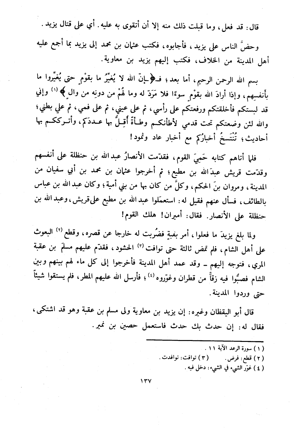 «1» وإني قد لبستكم فأخلقتكم ورفعتكم على رأسي، ثم على عيني، ثم على فمي، ثم علي بطني؛ والله لئن وضعتكم تحت قدمي لأطأنكم وطأة أقلّ بها عددكم، وأترككم بها أحاديث؛ تنتسخ أخباركم مع أخبار عاد وثمود! فلما أتاهم كتابه حمي القوم، فقدّمت الأنصار عبد الله بن حنظلة على أنفسهم وقدّمت قريش عبد الله بن مطيع؛ ثم أخرجوا عثمان بن محمد بن أبي سفيان من المدينة، ومروان بن الحكم، وكلّ من كان بها من بني أمية؛ وكان عبد الله بن عباس بالطائف، فسأل عنهم فقيل له: استعملوا عبد الله بن مطيع على قريش، وعبد الله بن حنظلة على الأنصار. فقال: أميران! هلك القوم! ولما بلغ يزيد ما فعلوا، أمر بقبة فضربت له خارجا عن قصره، وقطع «2» البعوث على أهل الشام، فلم تمض ثالثة حتى توافت «3» الحشود، فقدّم عليهم مسلم بن عقبة المري، فتوجه إليهم- وقد عمد أهل المدينة فأخرجوا إلى كل ماء لهم بينهم وبين الشام فصبّوا فيه زقاّ من قطران وغوّروه «4» ؛ فأرسل الله عليهم المطر، فلم يستقوا شيئا حتى وردوا المدينة.