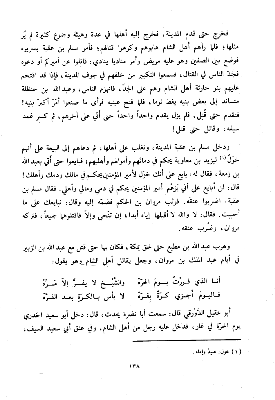 فخرج حتى قدم المدينة، فخرج إليه أهلها في عدة وهيئة وجموع كثيرة لم ير مثلها؛ فلما رآهم أهل الشام هابوهم وكرهوا قتالهم؛ فأمر مسلم بن عقبة بسريره فوضع بين الصفين وهو عليه مريض وأمر مناديا ينادي: قاتلوا عن أميركم أو دعوه فجدّ الناس في القتال، فسمعوا التكبير من خلفهم في جوف المدينة، فإذا قد اقتحم عليهم بنو حارثة أهل الشام وهم على الجدّ، فانهزم الناس، وعبد الله بن حنظلة متساند إلى بعض بنيه يغط نوما، فلما فتح عينيه فرأى ما صنعوا أمر أكبر بنيه! فتقدم حتى قتل، فلم يزل يقدم واحدا واحدا حتى أتي على آخرهم، ثم كسر غمد سيفه، وقاتل حتى قتل! ودخل مسلم بن عقبة المدينة، وتغلب على أهلها، ثم دعاهم إلى البيعة على أنهم خول «1» ليزيد بن معاوية يحكم في دمائهم وأموالهم وأهليهم؛ فبايعوا حتى أتي بعبد الله بن زمعة، فقال له: بايع على أنك خول لأمير المؤمنين يحكم في مالك ودمك وأهلك! قال: لن أبايع على أني بزعم أمير المؤمنين يحكم في دمي ومالي وأهلي. فقال مسلم بن عقبة: اضربوا عنقه. فوثب مروان بن الحكم فضمّه إليه وقال: نبايعك على ما أحببت. فقال: لا والله لا أقيلها إياه أبدا؛ إن تنّحي وإلّا فاقتلوهما جميعا، فتركه مروان، وضرب عنقه.