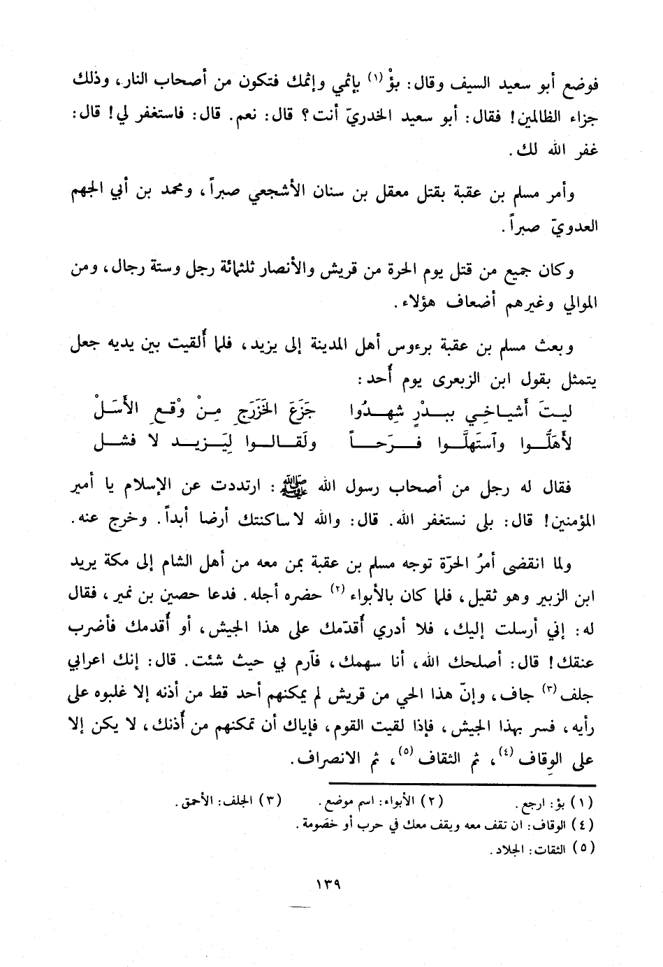 فوضع أبو سعيد السيف وقال: بؤ «1» بإثمي وإثمك فتكون من أصحاب النار، وذلك جزاء الظالمين! فقال: أبو سعيد الخدريّ أنت؟ قال: نعم. قال: فاستغفر لي! قال: