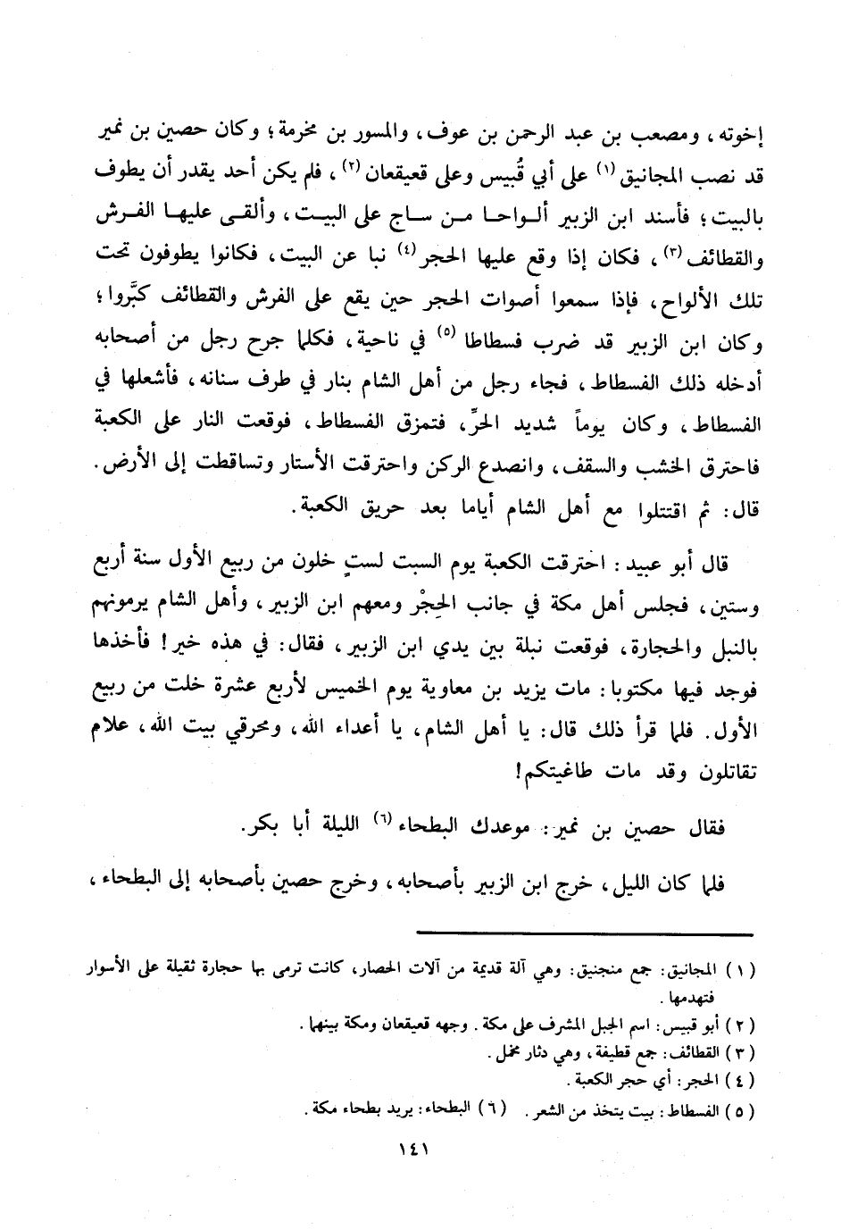 قال أبو عبيد: احترقت الكعبة يوم السبت لست خلون من ربيع الأول سنة أربع وستين، فجلس أهل مكة في جانب الحجر ومعهم ابن الزبير، وأهل الشام يرمونهم بالنبل والحجارة، فوقعت نبلة بين يدي ابن الزبير، فقال: في هذه خير! فأخذها فوجد فيها مكتوبا: مات يزيد بن معاوية يوم الخميس لأربع عشرة خلت من ربيع الأول. فلما قرأ ذلك قال: يا أهل الشام، يا أعداء الله، ومحرقي بيت الله، علام تقاتلون وقد مات طاغيتكم! فقال حصين بن نمير: موعدك البطحاء «6» الليلة أبا بكر.