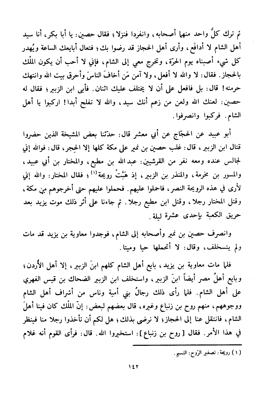 فلما مات معاوية بن يزيد، بايع أهل الشام كلهم ابن الزبير، إلا أهل الأردن؛ وبايع أهل مصر أيضا ابن الزبير، واستخلف ابن الزبير الضحاك بن قيس الفهري على أهل الشام. فلما رأى ذلك رجال بني أمية وناس من أشراف أهل الشام ووجوههم، منهم روح بن زنباع وغيره، قال بعضهم لبعض: إنّ الملك كان فينا أهل الشام، فانتقل عنا إلى الحجاز؛ لا نرضى بذلك؛ هل لكم أن تأخذوا رجلا منا فينظر في هذا الأمر. فقال [روح بن زنباع] : استخيروا الله. قال: فرأى القوم أنه غلام