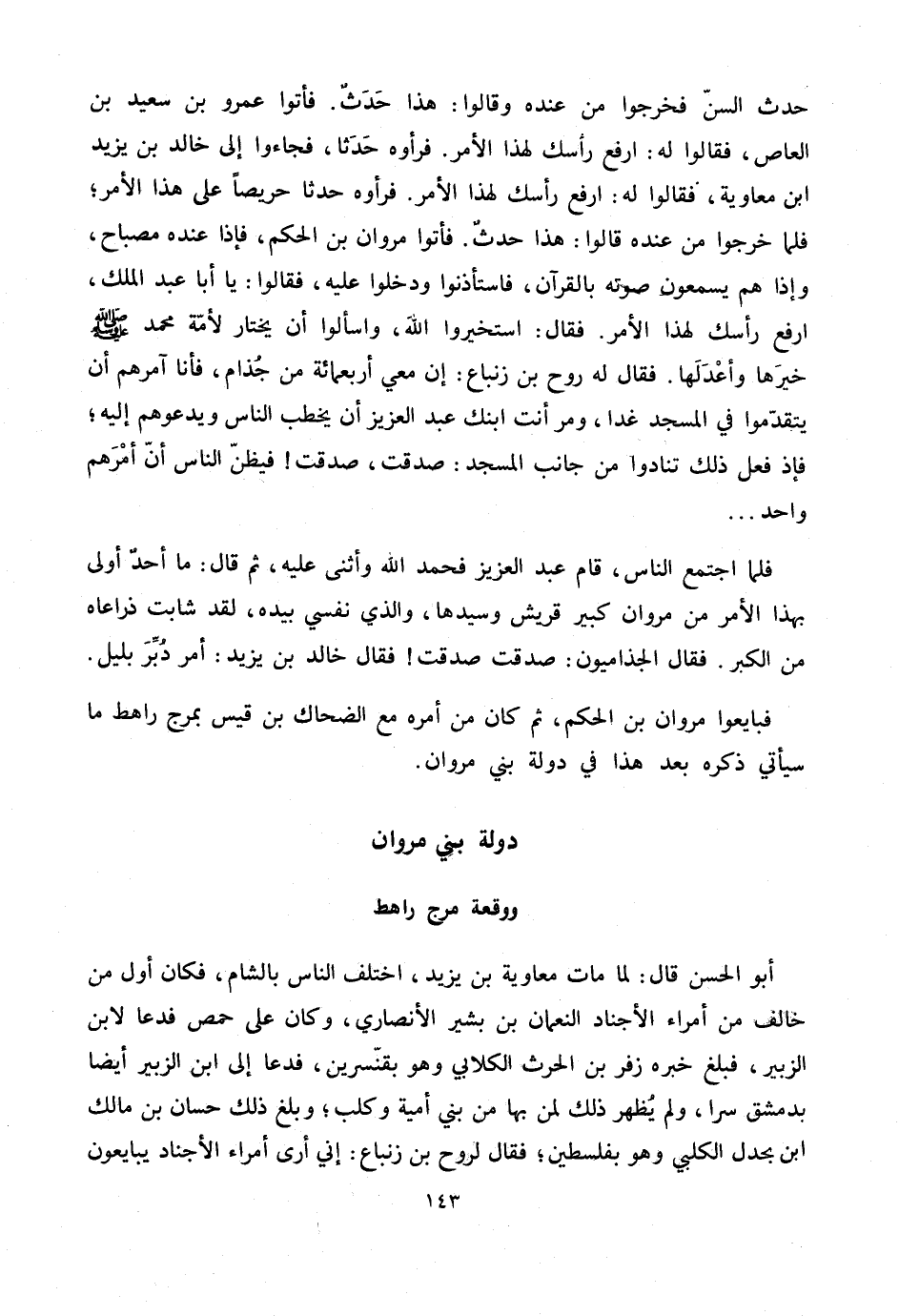 حدث السنّ فخرجوا من عنده وقالوا: هذا حدث. فأتوا عمرو بن سعيد بن العاص، فقالوا له: ارفع رأسك لهذا الأمر. فرأوه حدثا، فجاءوا إلى خالد بن يزيد ابن معاوية، فقالوا له: ارفع رأسك لهذا الأمر. فرأوه حدثا حريصا على هذا الأمر؛ فلما خرجوا من عنده قالوا: هذا حدث. فأتوا مروان بن الحكم، فإذا عنده مصباح، وإذا هم يسمعون صوته بالقرآن، فاستأذنوا ودخلوا عليه، فقالوا: يا أبا عبد الملك، ارفع رأسك لهذا الأمر. فقال: استخيروا الله، واسألوا أن يختار لأمّة محمد صلّى الله عليه وسلم خيرها وأعدلها. فقال له روح بن زنباع: إن معي أربعمائة من جذام، فأنا آمرهم أن يتقدّموا في المسجد غدا، ومر أنت ابنك عبد العزيز أن يخطب الناس ويدعوهم إليه؛ فإذ فعل ذلك تنادوا من جانب المسجد: صدقت، صدقت! فيظنّ الناس أنّ أمرهم واحد ...
